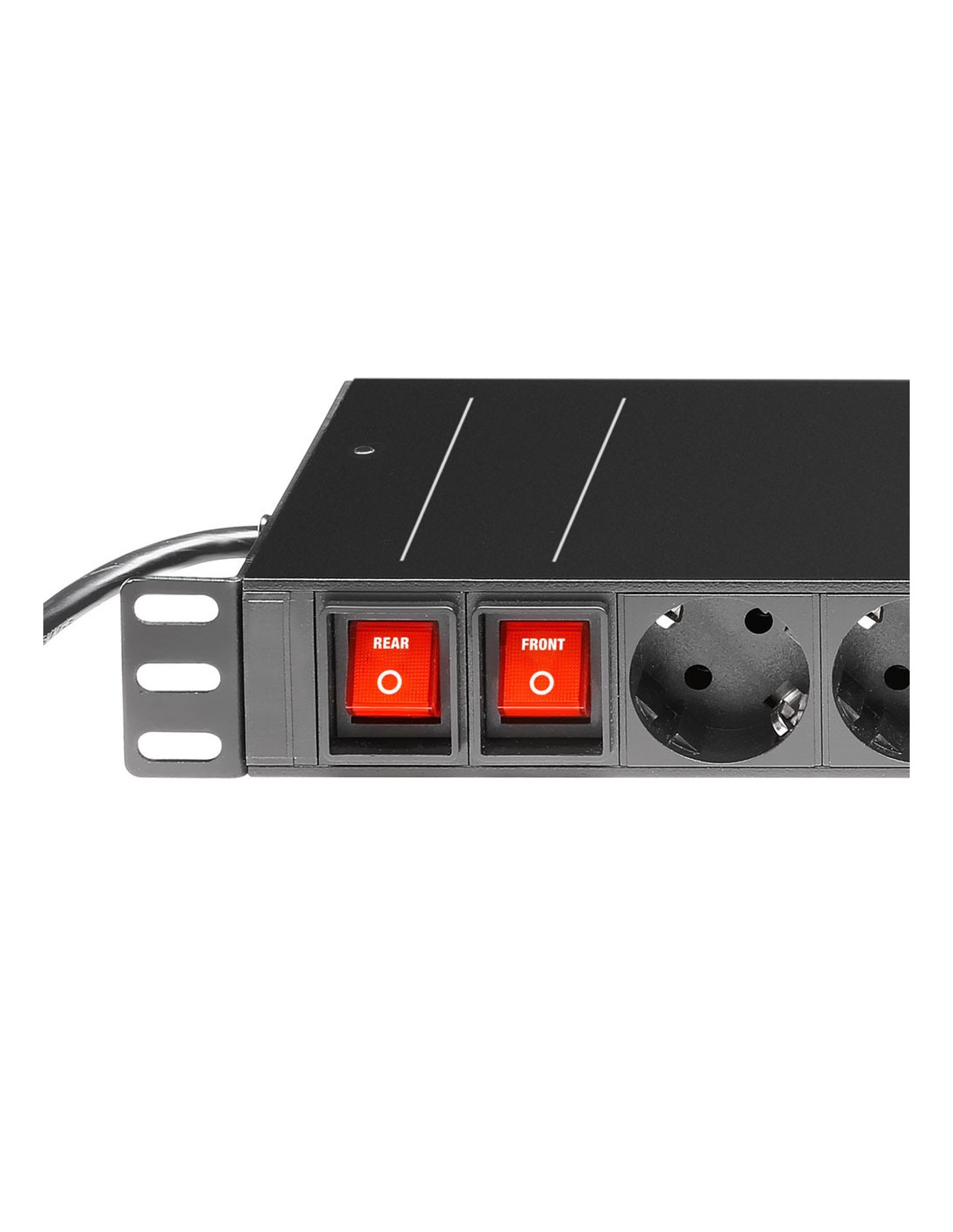La 874716 offre un total de 16 prises avec protection de contacts, rassemblées en un boîtier alu rackable 19 pouces de 1 U de hauteur, doté d'un câble secteur de 2 m et d’une fiche secteur coudée CEE 7/7. Elle possède 8 prise à l’avant, 8 autres à l’arrière. Chaque série de 8 prises est commutable séparément via un interrupteur éclairé 2 pôles, et possède une protection contre toute surcharge, réarmable séparément.