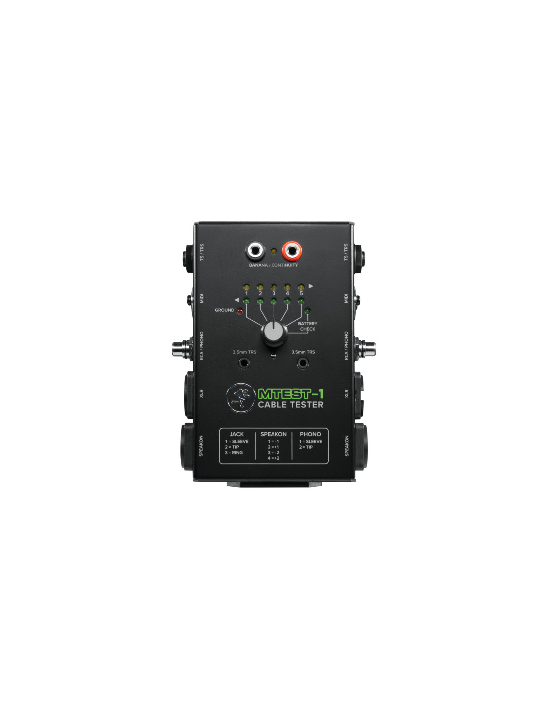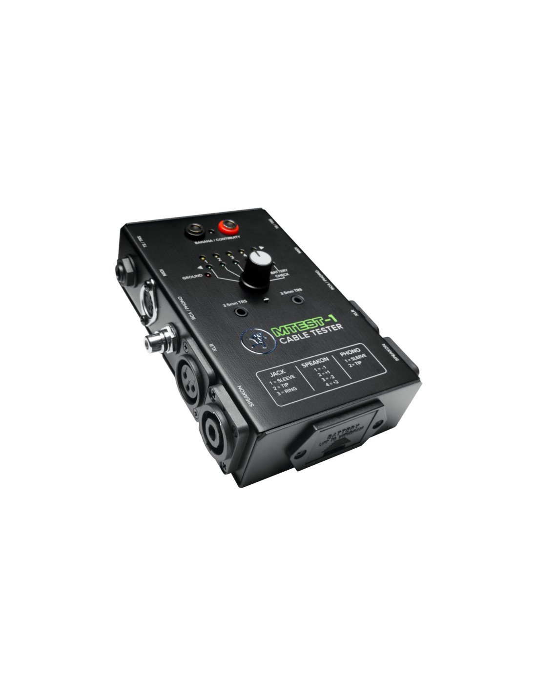 Testeur de câbles: jack 3.5/6.35mm (mono/stéréo), XLR fem./mâle (mono/stéréo), RCA, speakon, MIDI, banane alimenté par une pile 9V.