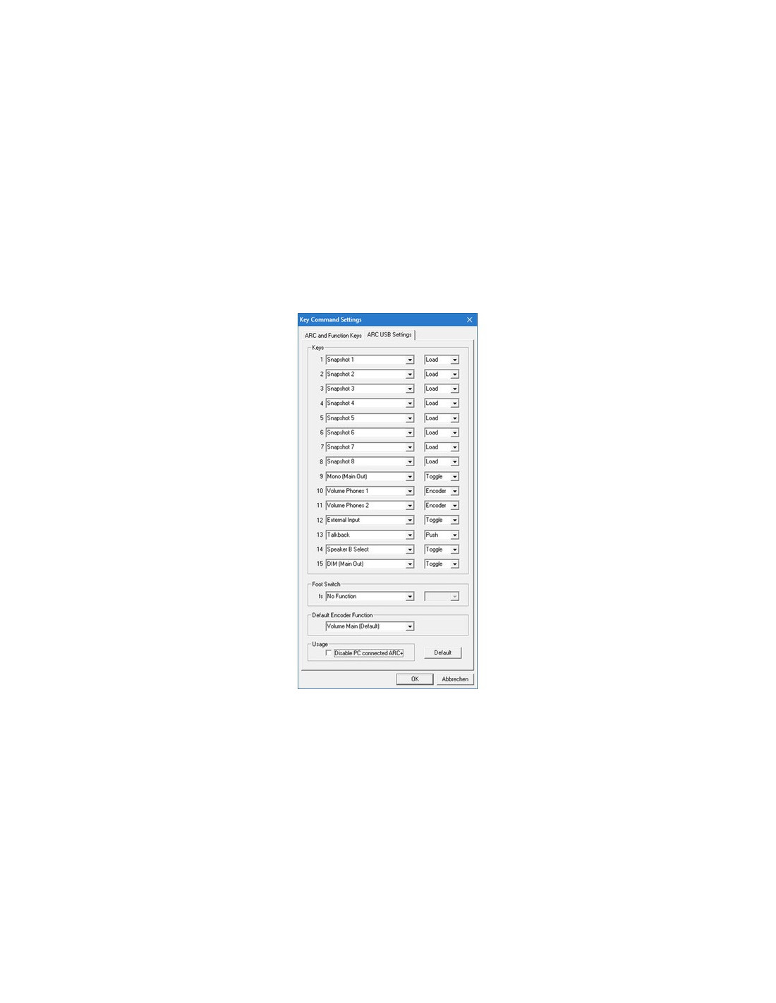 L'ARC USB est configurée en standard ave un jeu de commandes (Key Commands) qui couvrent la plupart des scénarios utiles, directement sérigraphiées en dessous des touches :