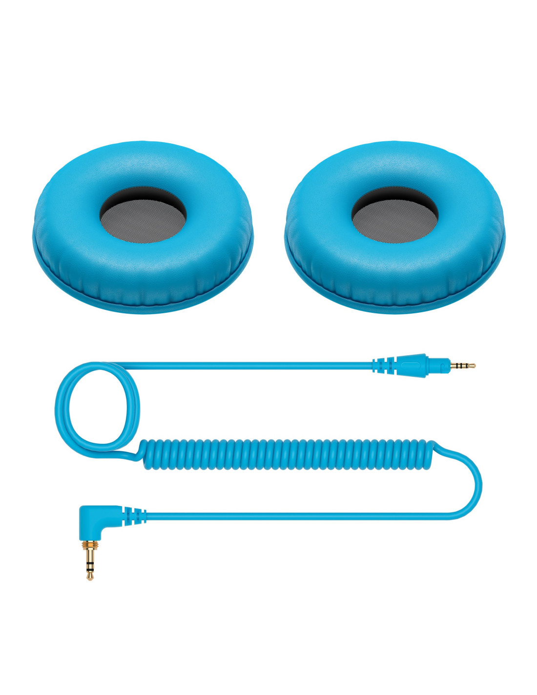 Câble enroulé court et coussinets d’oreilles en cuir pour le casque HDJ-CUE1. Couleur bleu.