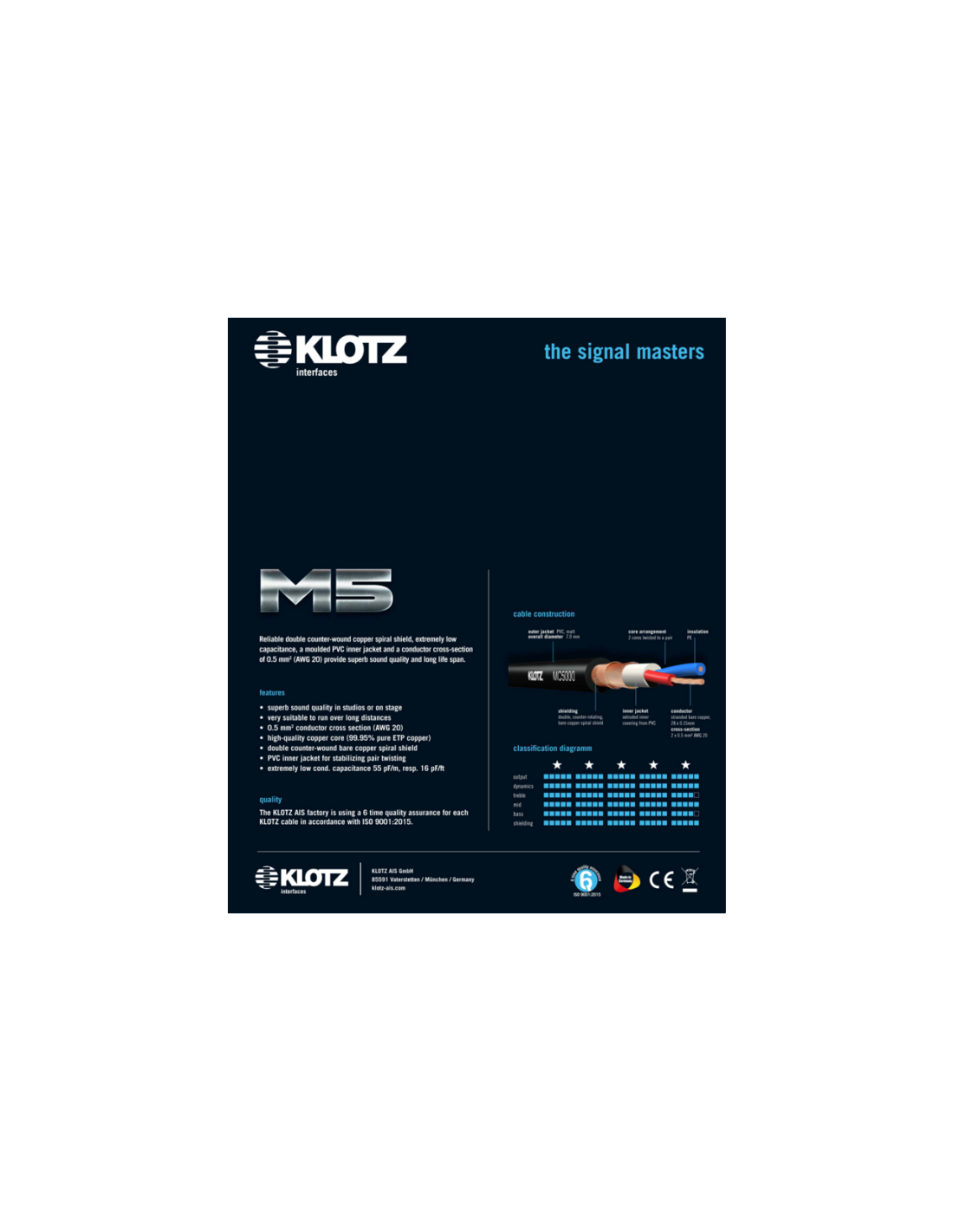 En tant que câble professionnel pour microphone, le M5 brille encore également par sa conception unique, qui n'existe sous cette forme chez aucun autre fabricant: une section de conducteur extra grosse de 0,5 mm² garantit la plus grande transparence et la meilleure résolution, La capacité a une valeur absolument au top avec seulement 55pF/m.