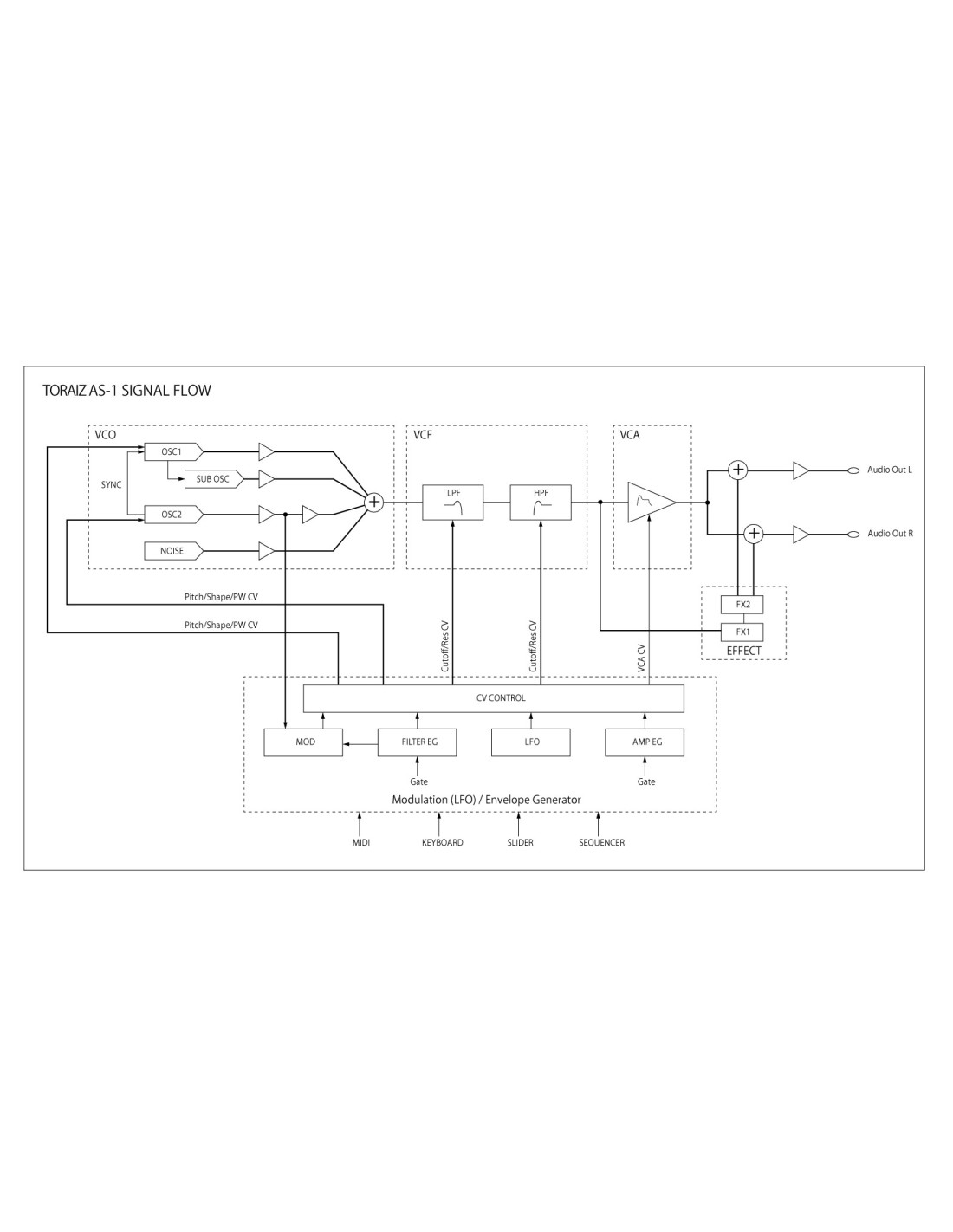 Utilisez le TORAIZ AS-1 pour créer des sons uniques en utilisant 2 VCO, 2 VCF, le VCA, 2 EG et 1 LFO, puis enregistrez chaque son et ses paramètres comme un programme, pour pouvoir y accéder instantanément plus tard.