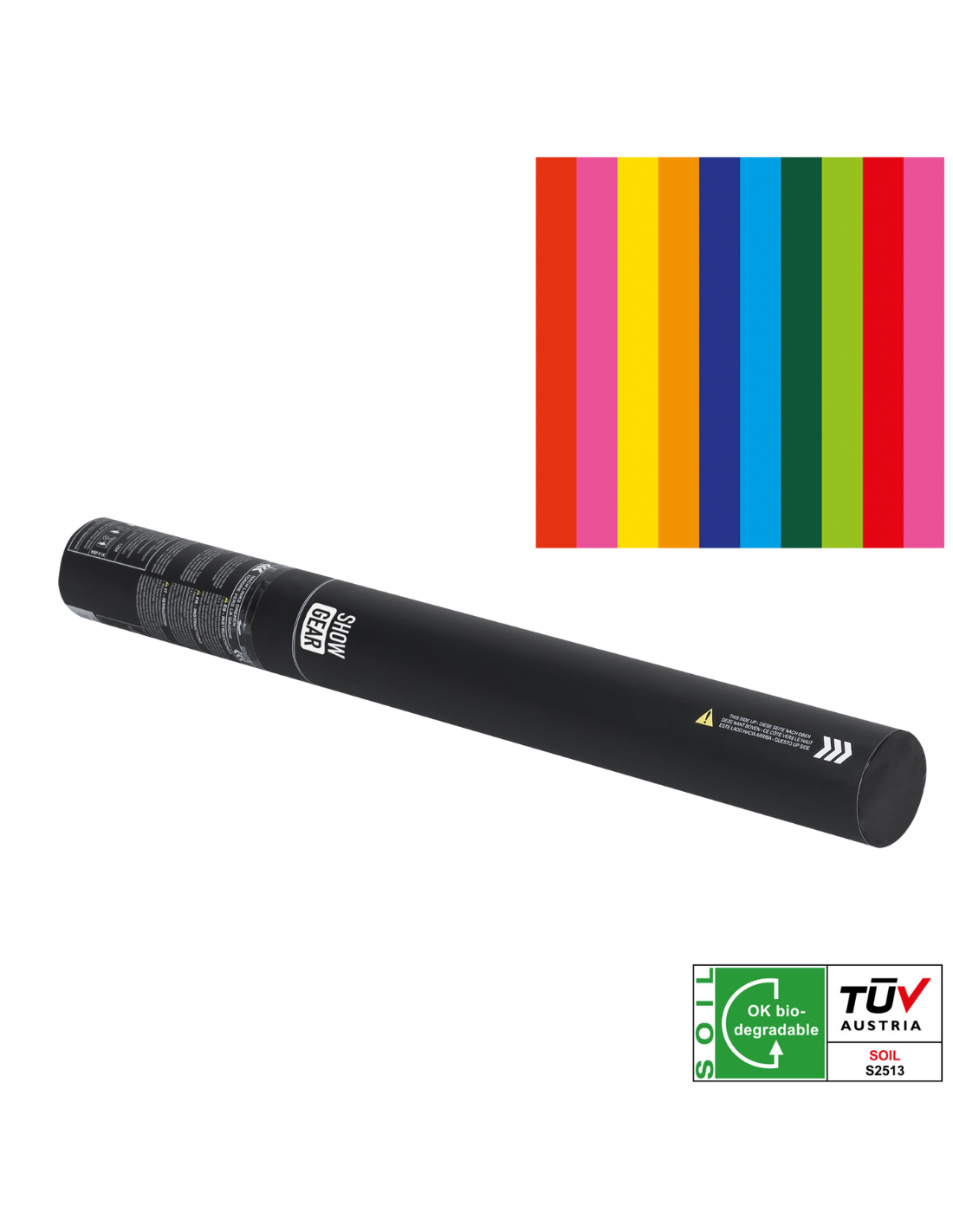Canon 50 cm à usage unique prérempli de serpentins multicolores; ils sont certifiés ignifuges conformément à la norme anti-feu et biodégradables.