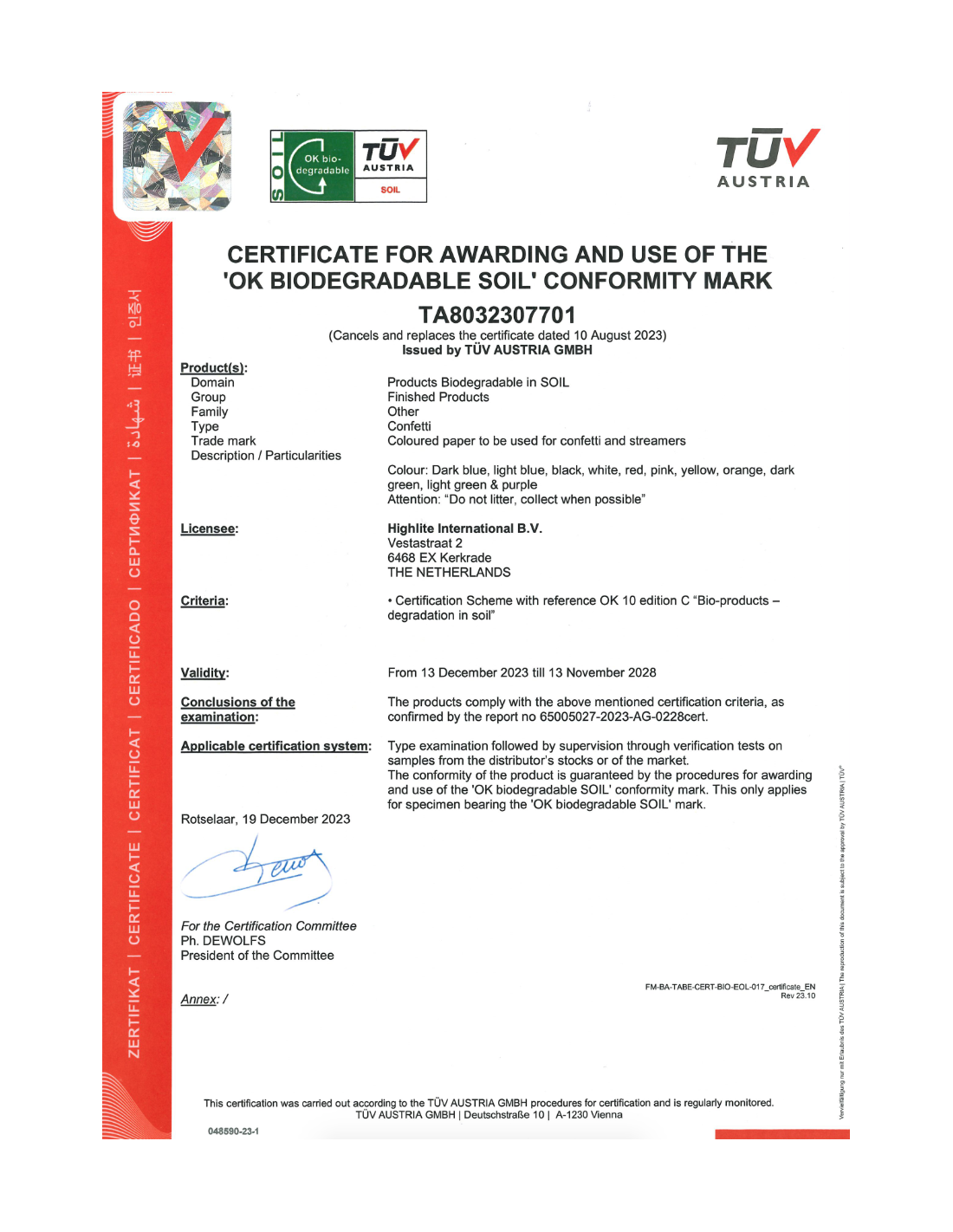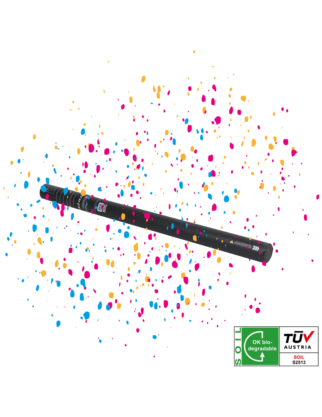 Canon 50 cm à usage unique prérempli de confettis multicolore; ils sont certifiés ignifuges conformément à la norme anti-feu et biodégradables.