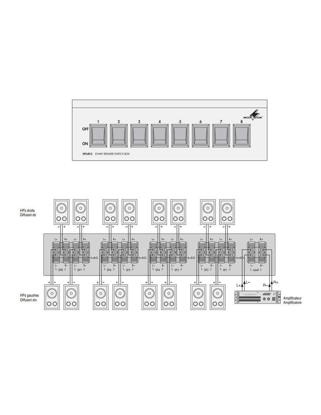 * Pour relier jusqu'à 8 paires d'enceintes (4-8 Ω) à une sortie d'amplificateur stéréo