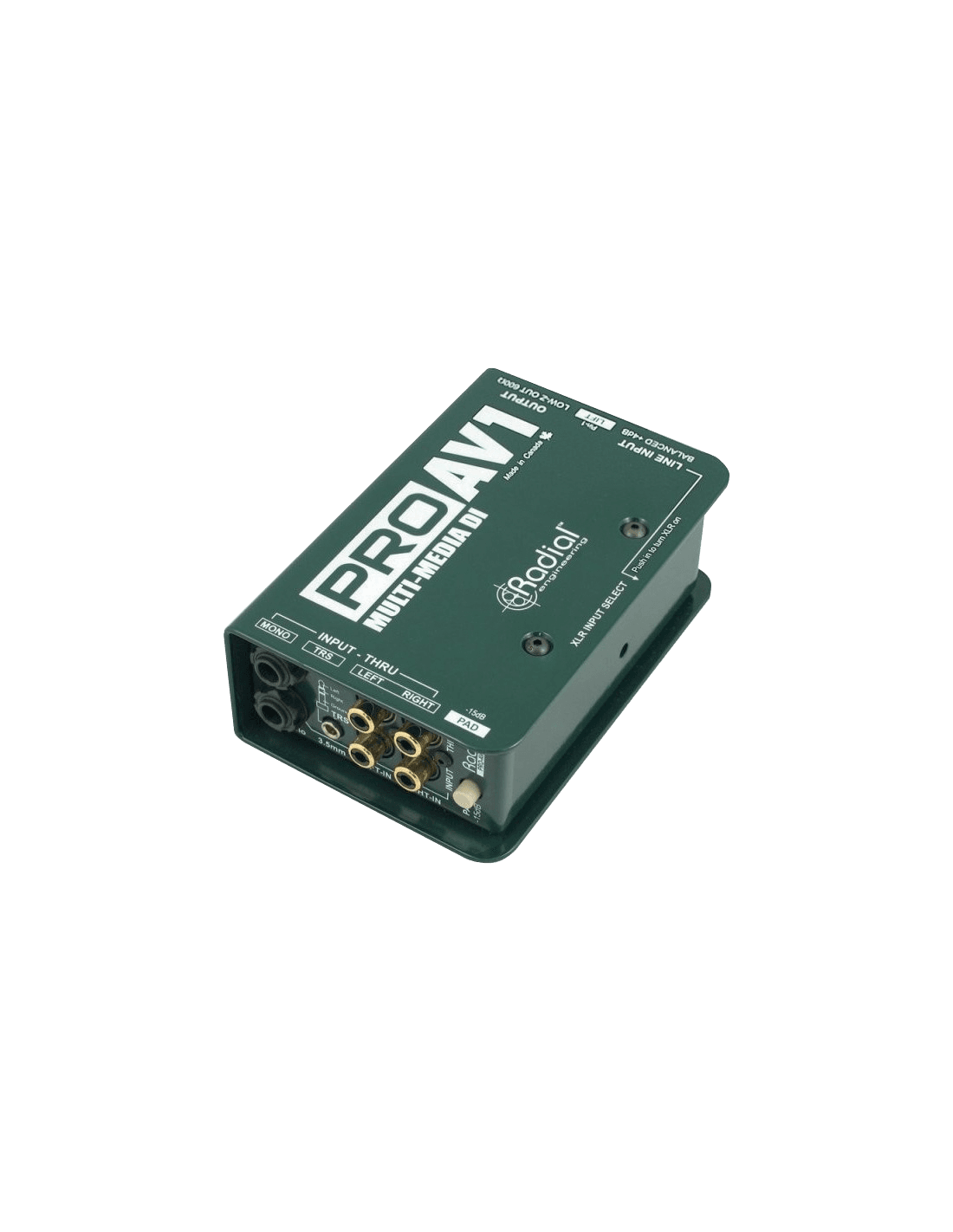 La ProAV1 est une DI passive mono spécialement conçue pour les professionnels de l'audio/vidéo à la recherche d'une D.I. genre "couteau suisse". Un transformateur Radial custom de haute qualité est utilisé pour la conversion d'impédance et la symétrisation du signal. La présence du transformateur élimine les bruits causés par les boucles de masse. Les transformateurs sont isolés électro-magnétiquements afin de réduire les bruits parasites induits par les champs magnétiques extérieurs.