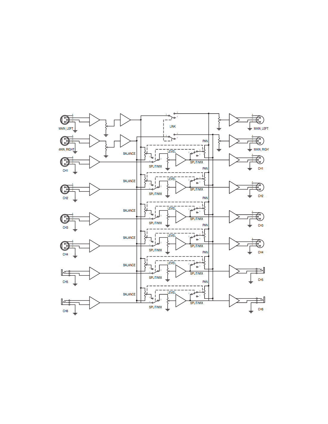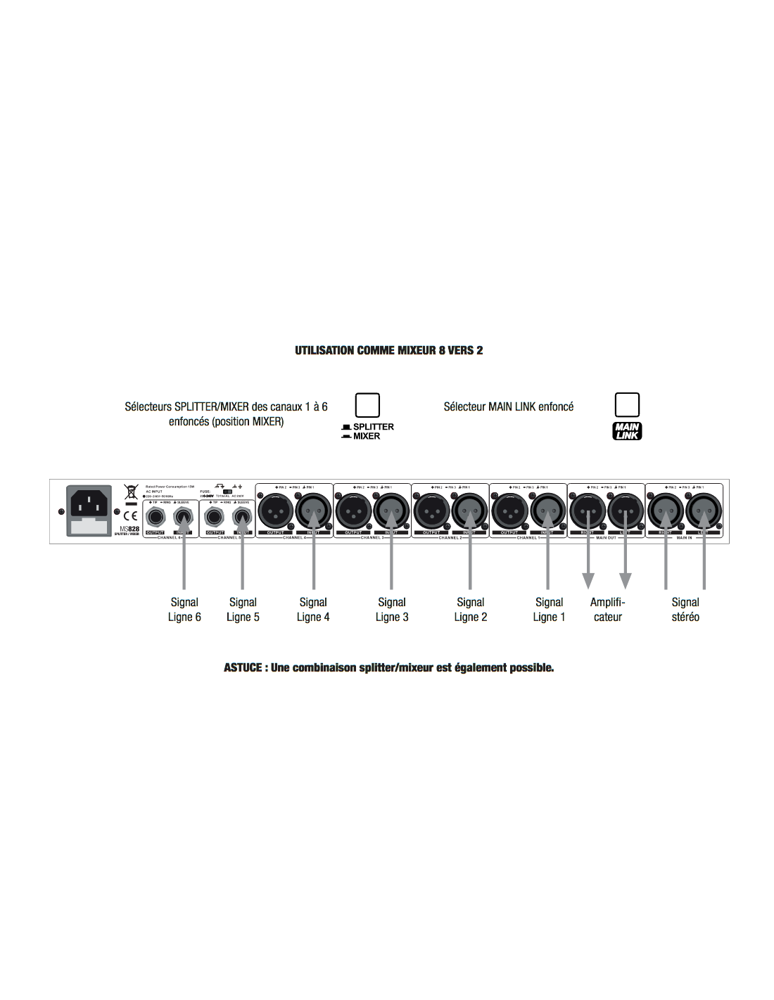 - Contrôles : Potentiomètres Main Input Level, Main Output Level, Main Link, Level canaux 1-6, Bal/Pan canaux1-6 ; sélecteurs Splitter/Mixer sur canaux 1-6, Power, Ground Lift