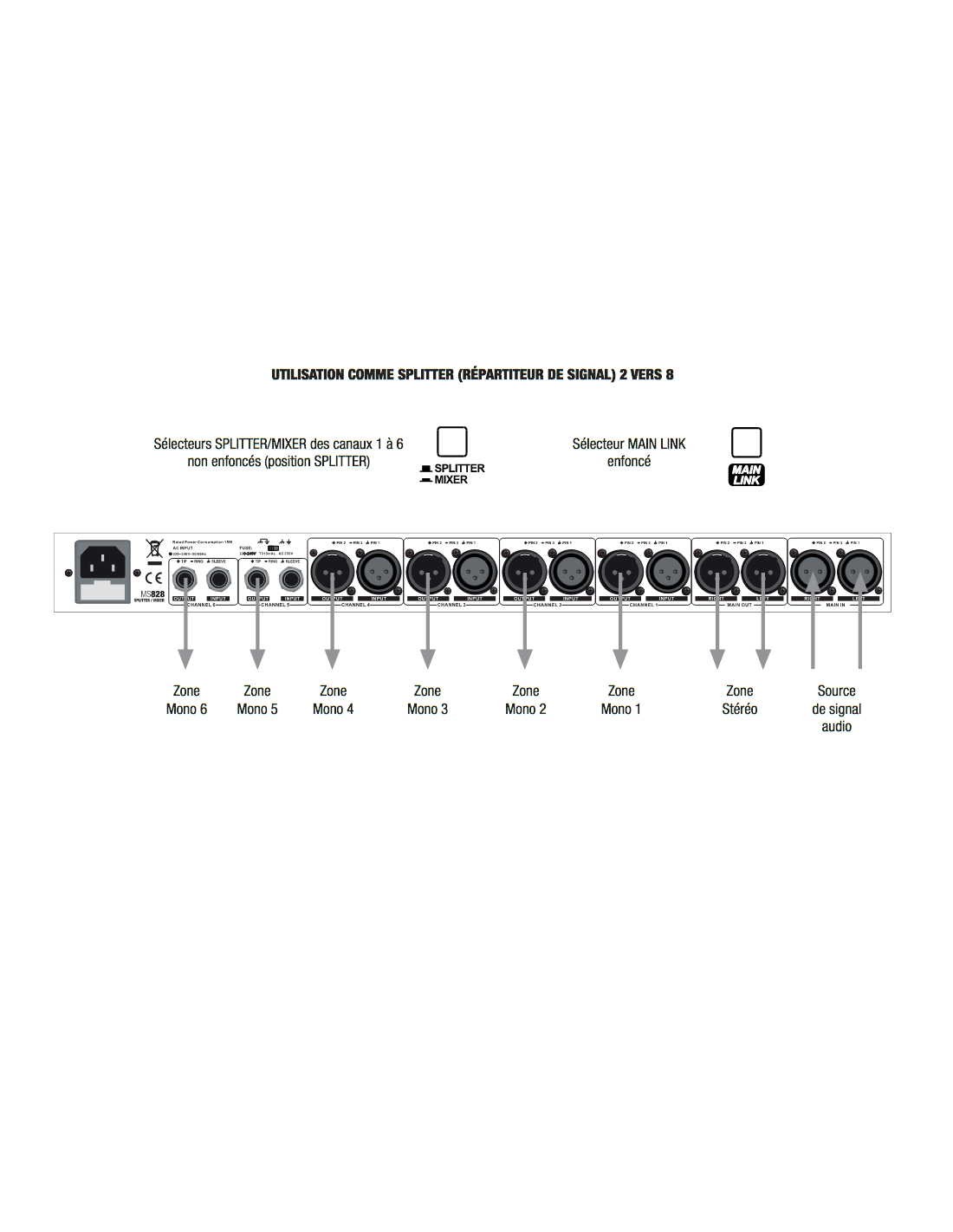 - Indicateurs : échelles 6 LED pour les niveaux d'entrée et de sortie stéréo (Main Input et Output)) et mono (canaux 1 à 6), indicateur LED Main Link et Power