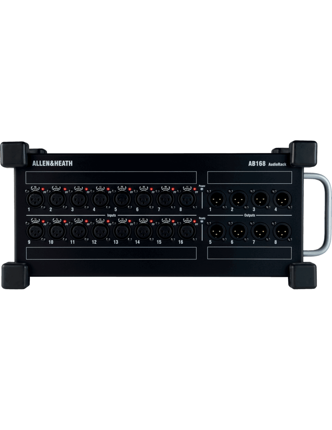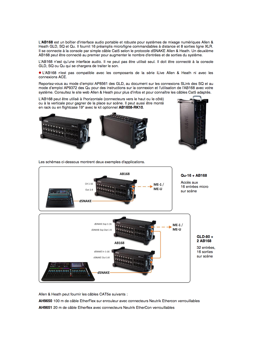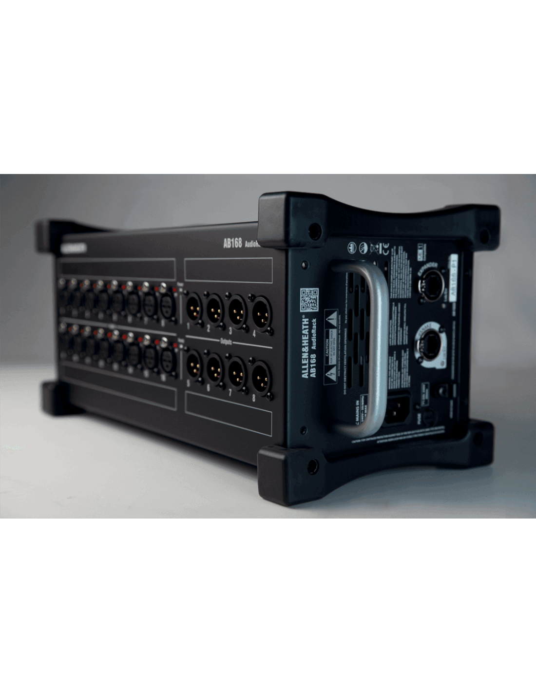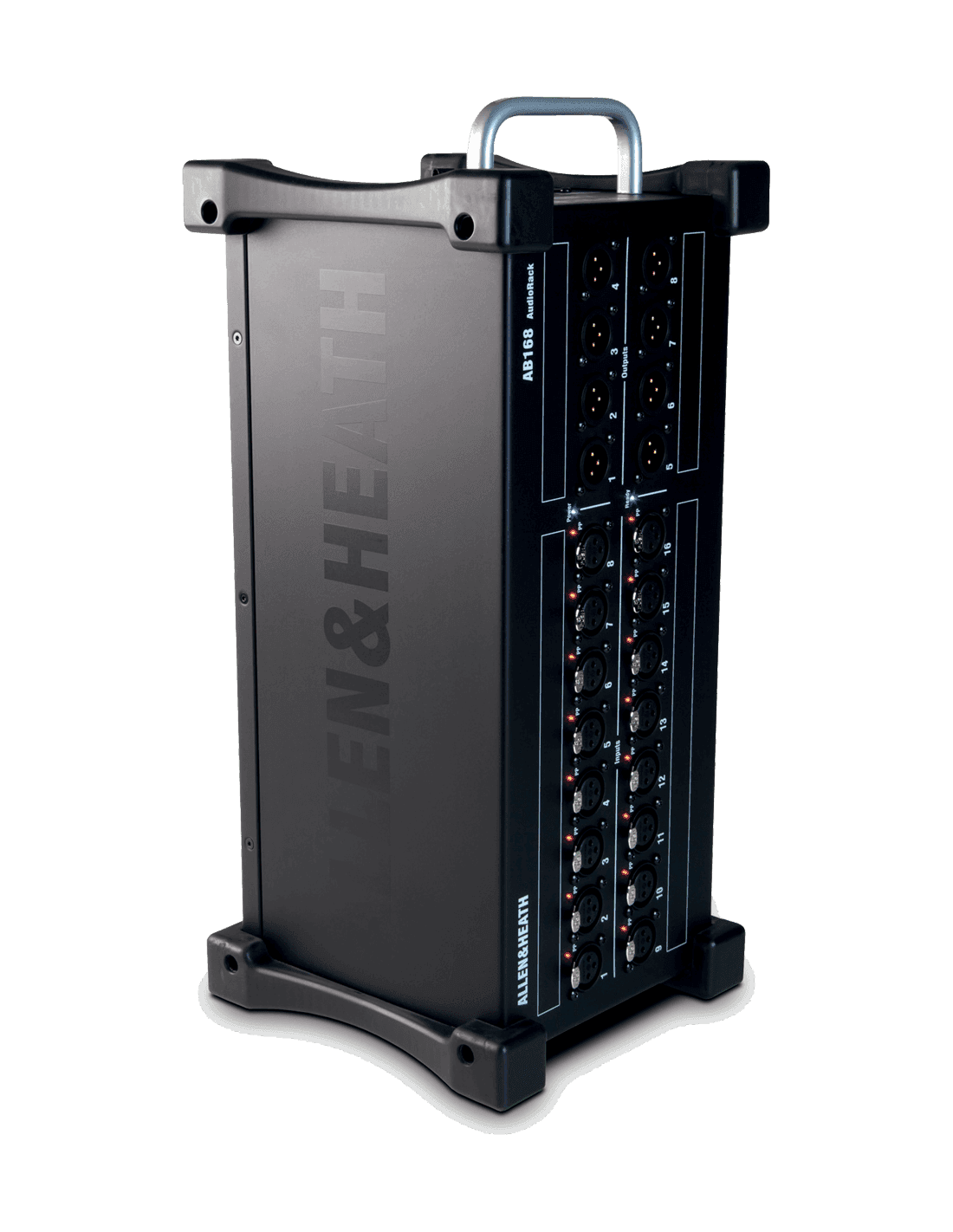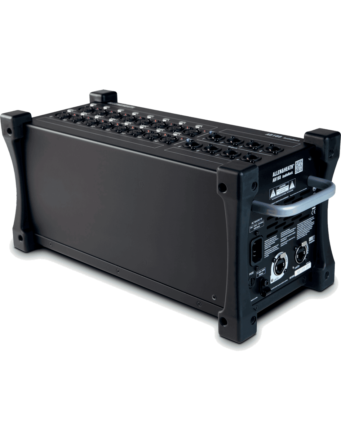 Équipé de 16 préampli micro dotés d'indicateurs d'alimentation phantom et de 8 sorties XLR, il utilise le protocole propriétaire dSnake d'Allen&Heath pour communiquer avec les consoles Qu, SQ et GLD. La connexion aux consoles ou à un audiorack AR2412 s'effectue via un simple câble réseau Cat5 équipé d'un connecteur EtherCon. L'AB168 est équipé d'un second port réseau EtherCon, permettant de connecter en série un autre AB168 ou de connecter un moniteur personnel ME-1.