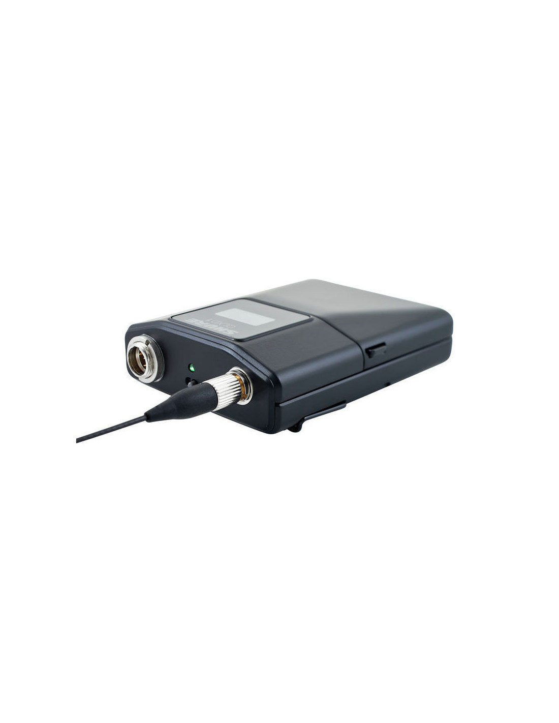 Émetteur ceinture avec embase TQG 4 broches mâle TA4M. Antenne ¼ onde détachable. Alimentation par deux piles LR6 ou avec un accu Lithium-Ion SB900A, disponible en option.