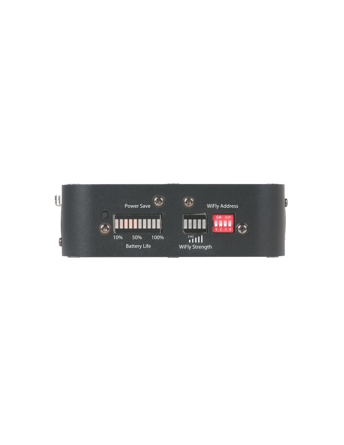 La batterie du WiFLY EXR Battery a une autonomie de 20 heures. Des indicateurs de charge et de puissance de signal DMX se trouvent sur le côté de l’émetteur/récepteur. De plus, la base est munie d’une plaque magnétique permettant d’attacher le WiFly EXR Battery temporairement à un appareil d’éclairage ou un objet métallique. La fréquence de transmission de 2.4GHz coexiste sans interférences dans des endroits à forte radiofréquences comme le Bluetooth ou le Wi-Fi.