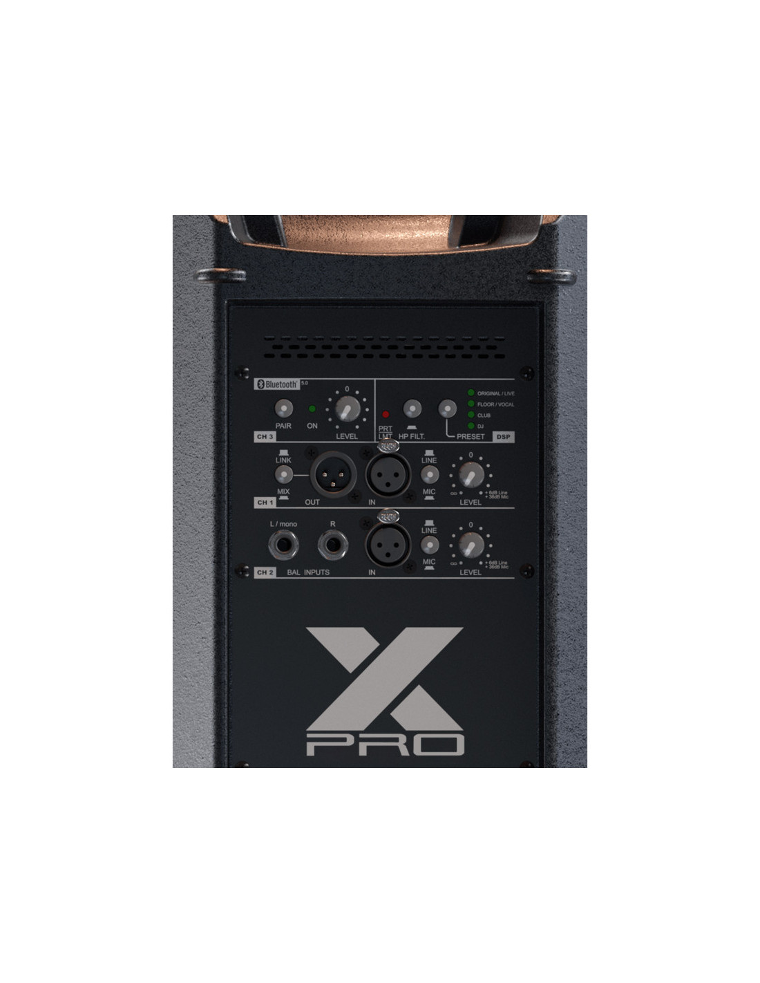 Enceinte amplifie, 2 voies Bass-reflex, amplification numérique 1500W, avec mixer 3 canaux, connectivité Bluetooth, DSP 4 Preset, haut parleur de 15" custom, tweeter 1" couplé à un pavillon orientable, dans un boitier en Bois.