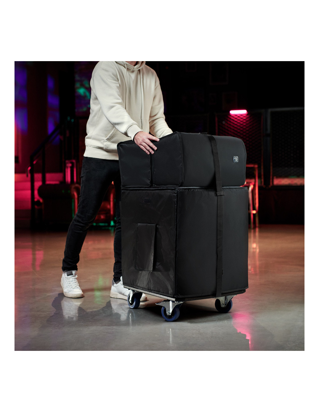 Les housses de protection rembourrées en nylon 1680D durable et hydrofuge protègent de manière optimale le système DAVE 18 G4X des intempéries et autres influences. Les housses de protection avec doublure, de 8 mm d'épaisseur, sont faciles à mettre en place et, alliées au plateau à roulettes, assurent une protection complète. Les découpes renforcées avec des rabats en velcro permettent de saisir et de transporter le système même avec sa protection en place. La housse de protection du caisson de graves possède une poche extérieure pour ranger les accessoires tels que les câbles secteur et Speakon ainsi que la sangle d'arrimage.