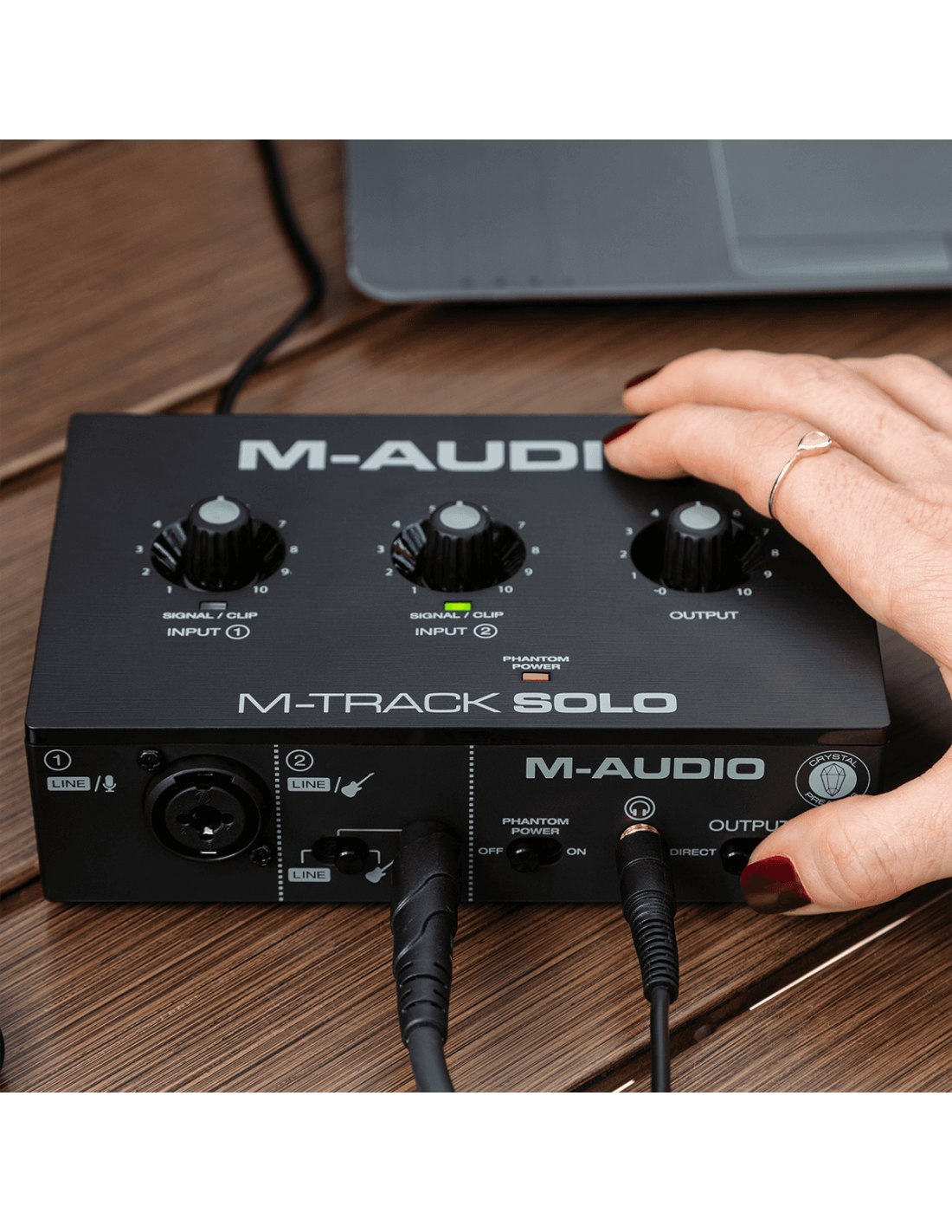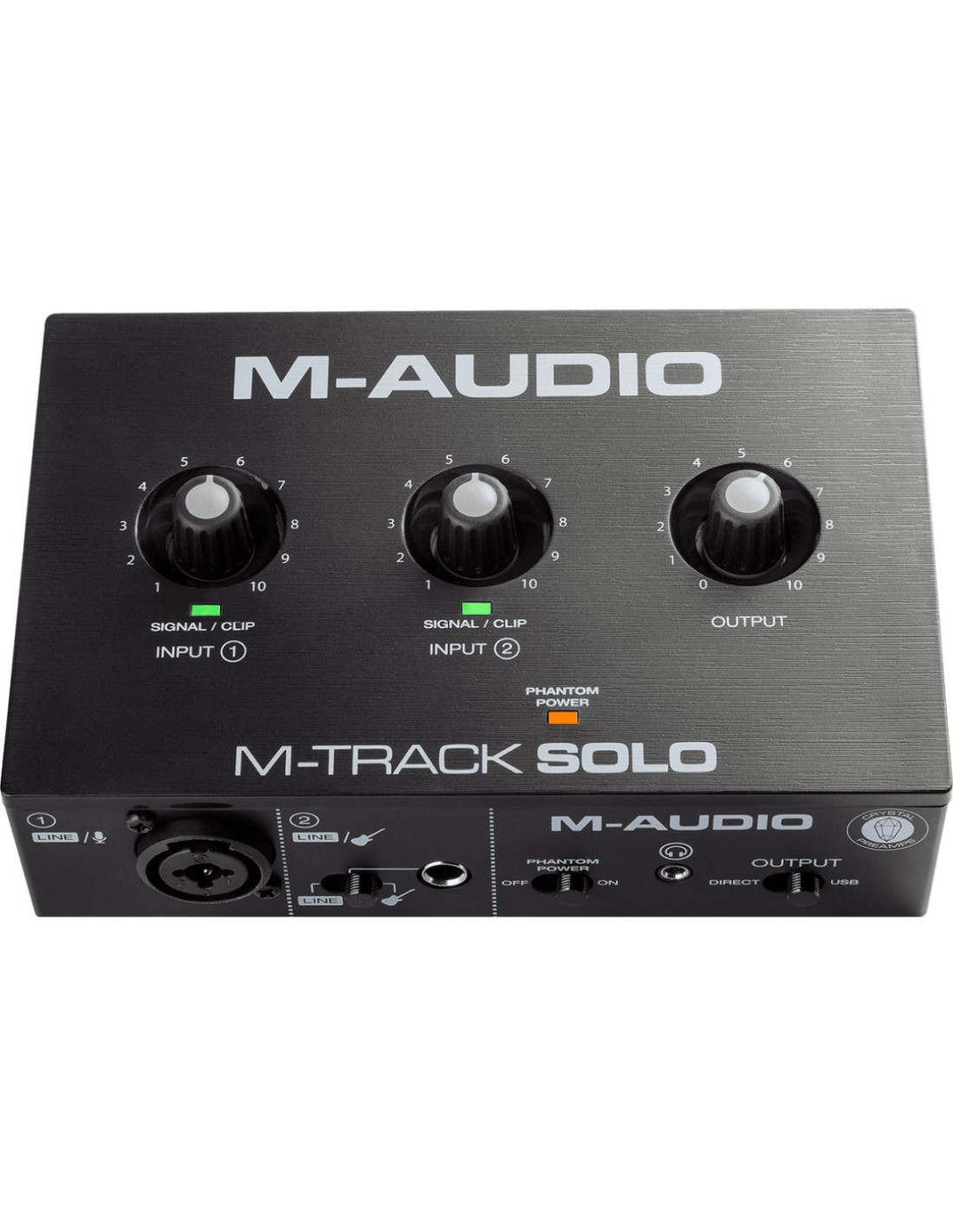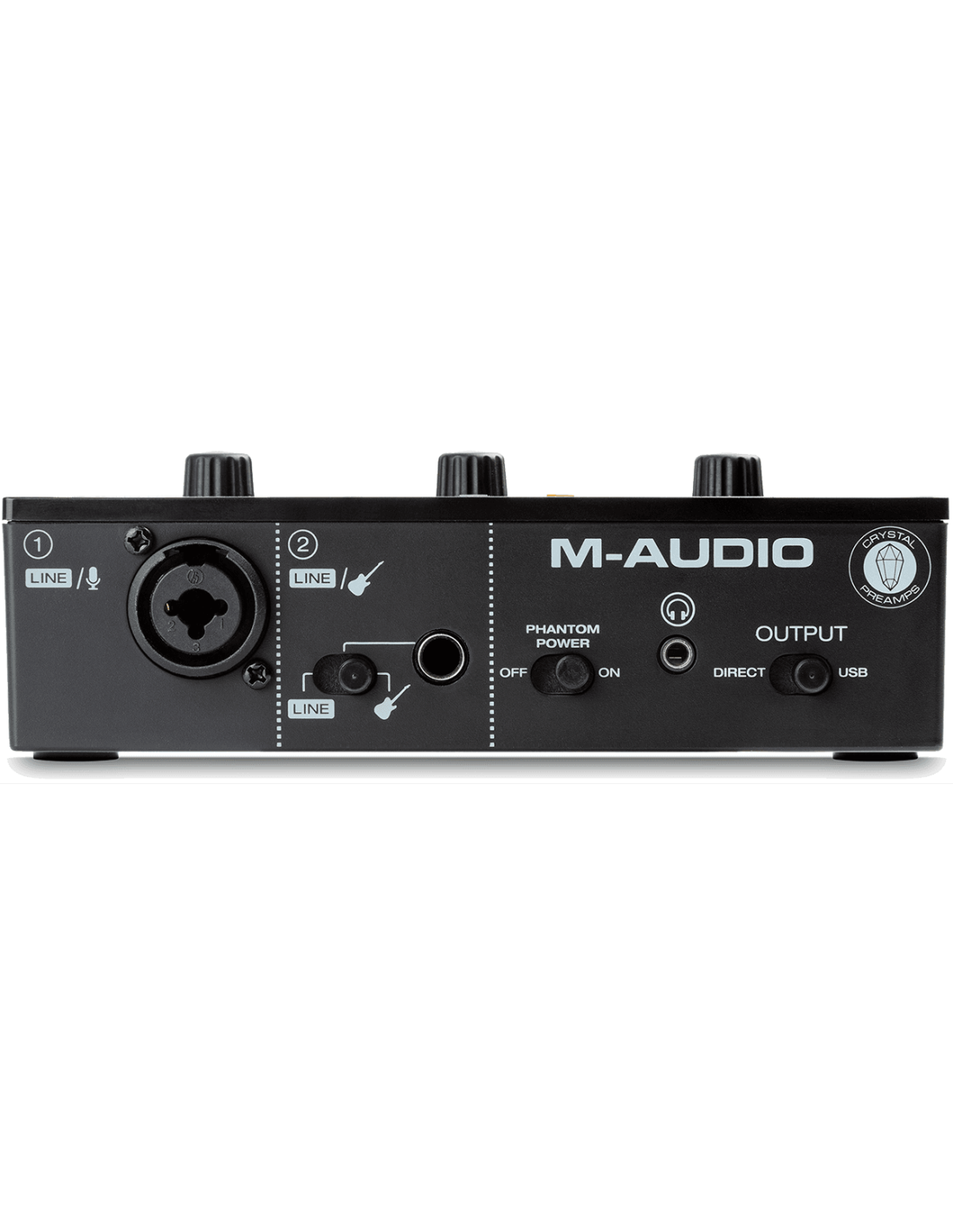 - Entrées : 1 combo XLR/Jack avec préampli M-Audio Crystal et alimentation fantôme 48V pour les micros statiques, 1 format jack commutable niveau ligne/instrument.