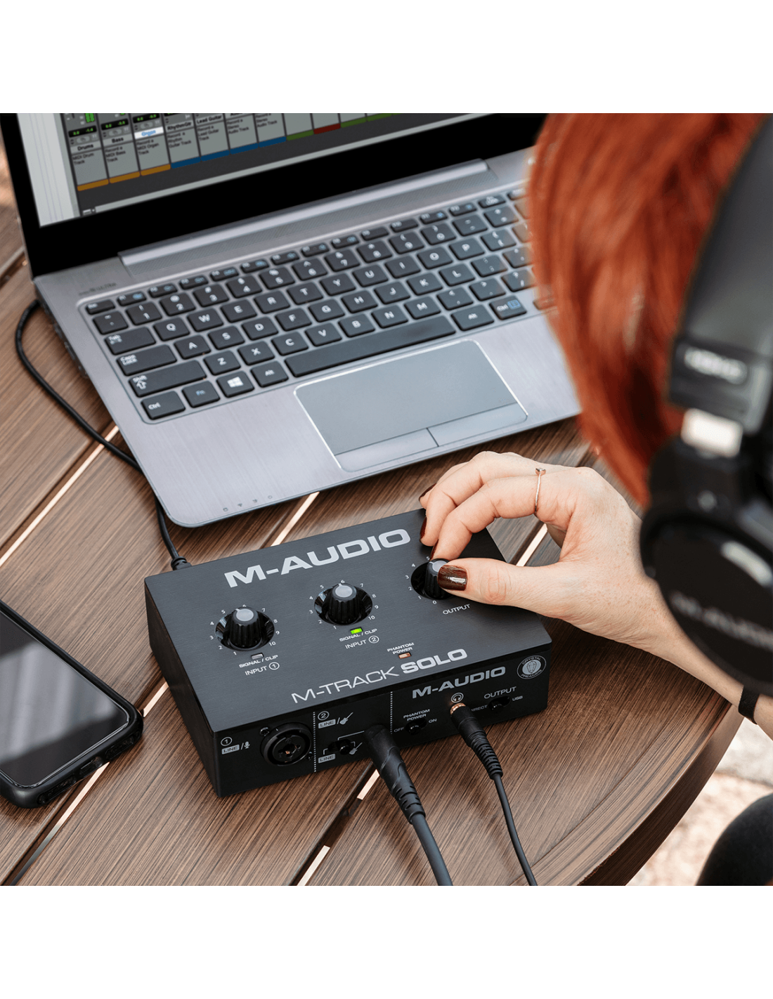La M-Track Solo présente un système de monitoring simple mais efficace, qu'elle soit micro, ligne ou instrument, via la sortie casque minijack ou les sorties principales au format jack, et ce sans aucune latence.