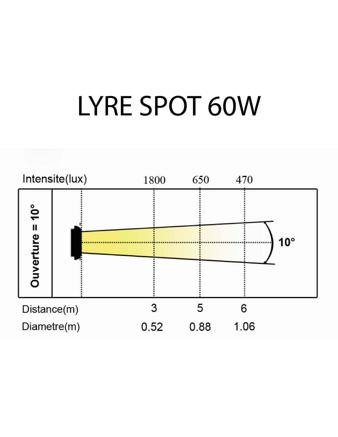 Satisfaction assurée avec la Lyre Spot 60W et sa technologie led 60W d’une durée de vie de 50.000 heures. Hyper réactive avec ses trois modes de fonctionnement et composée d’une palette de 7 gobos, la Lyre Spot 60W saura s’adapter à toutes vos prestations ou installations.