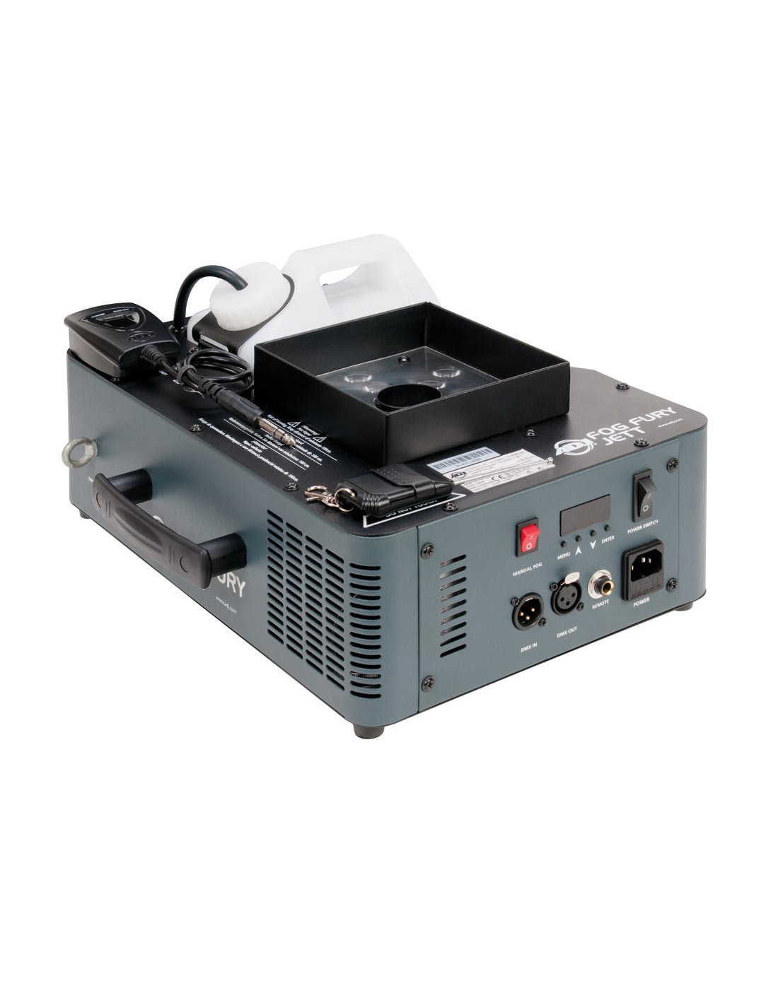Le Fog Fury Jett peut être utilisé à la verticale ou à l'horizontale. Le réservoir peut être monté à l'avant ou à l'arrière de l'appareil selon que la machine doit être orientée vers le haut ou vers le bas. La télécommande sans fil ADJ FFJWR est livrée avec le Fog Fury Jett.