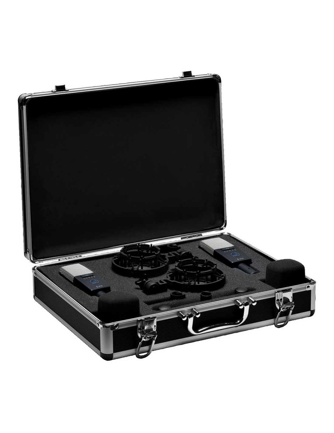 Version appairée du micro AKG C414 B-XLS, livré en malette métal, avec suspensions type spider, bonnettes mousse