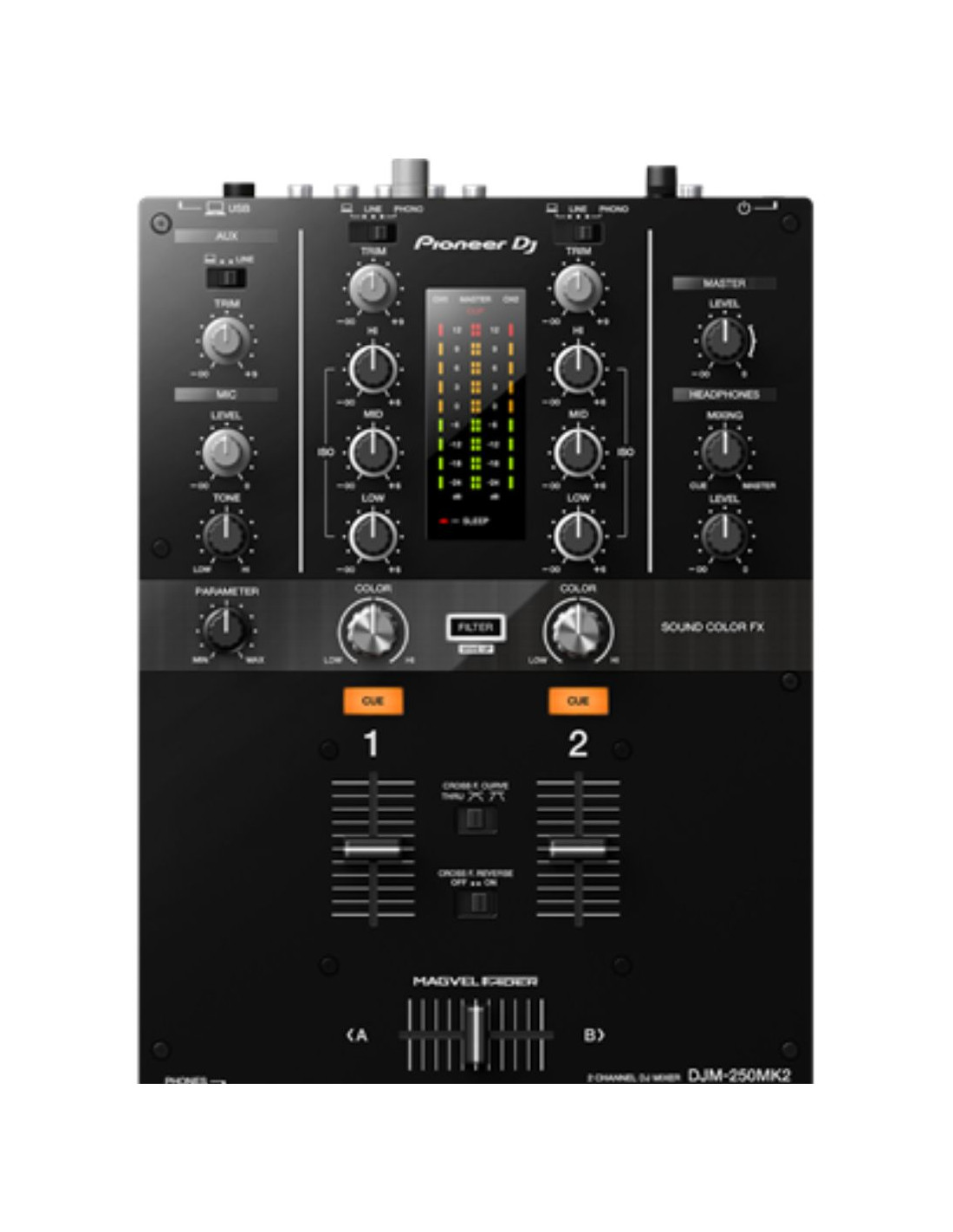 La DJM-250MK2 a hérité de certaines des caractéristiques professionnelles de la fameuse DJM-900NXS2, comme son crossfader Magvel et son filtre d’Effets Sound Colour. Des contrôles directs, une présentation claire, et des isolateurs 3 bandes dédiés vous permettent de mixer et scratcher instinctivement.