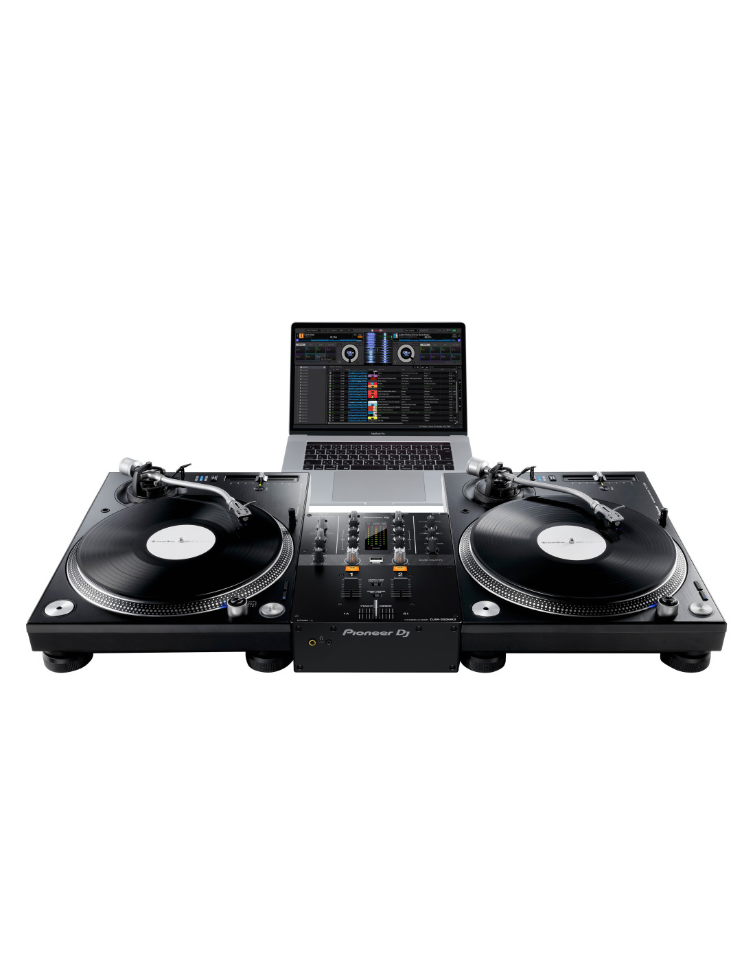 Ou bien vous pouvez relier la DJM-250MK2 à des platines vinyles et utiliser rekordbox en combinaison avec notre vinyle de contrôle pour scratcher et mixer à partir de fichiers numériques stockés dans votre ordinateur.