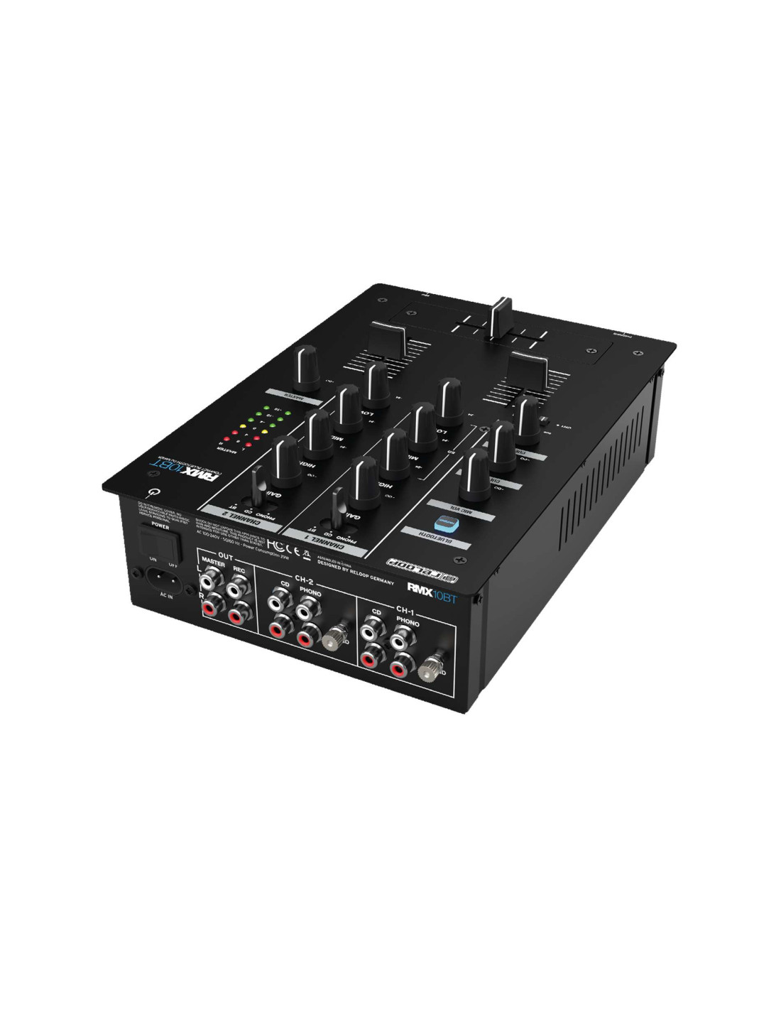 De plus, le crossfader de 45 mm est remplaçable par l'utilisateur et les curseurs lisses rendent le mixage plus confortable. Chaque canal possède un contrôle de gain individuel et un égaliseur 3 bandes qui augmente ou diminue les fréquences à 100 Hz, 1 kHz et 10 kHz. Le RMX-10 BT dispose d'une entrée microphone de 6,3 mm avec réglage séparé du volume, ainsi que d'une sortie casque de 6,3 mm avec réglage du volume et fonction cue-mix. Le volume de sortie maître peut être surveillé par des chaînes de niveau à LED. La construction robuste et peu encombrante est en métal.