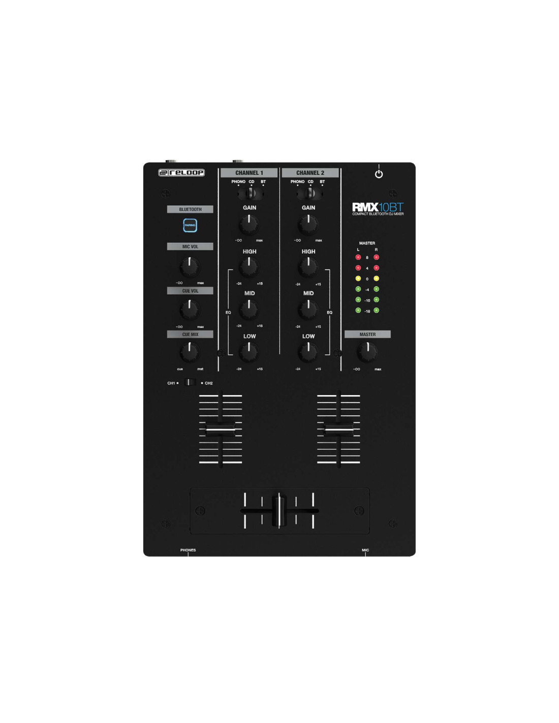 Le RMX-10 BT de Reloop est un mixeur DJ compact à 2 canaux, qui facilite la diffusion de musique sans fil directement sur le mixeur via l'interface Bluetooth intégrée. De ce fait, il est possible d'utiliser un smartphone ou une tablette comme source de lecture et d'acheminer le signal à travers le mélangeur. Le signal Bluetooth peut être acheminé vers les deux canaux.
