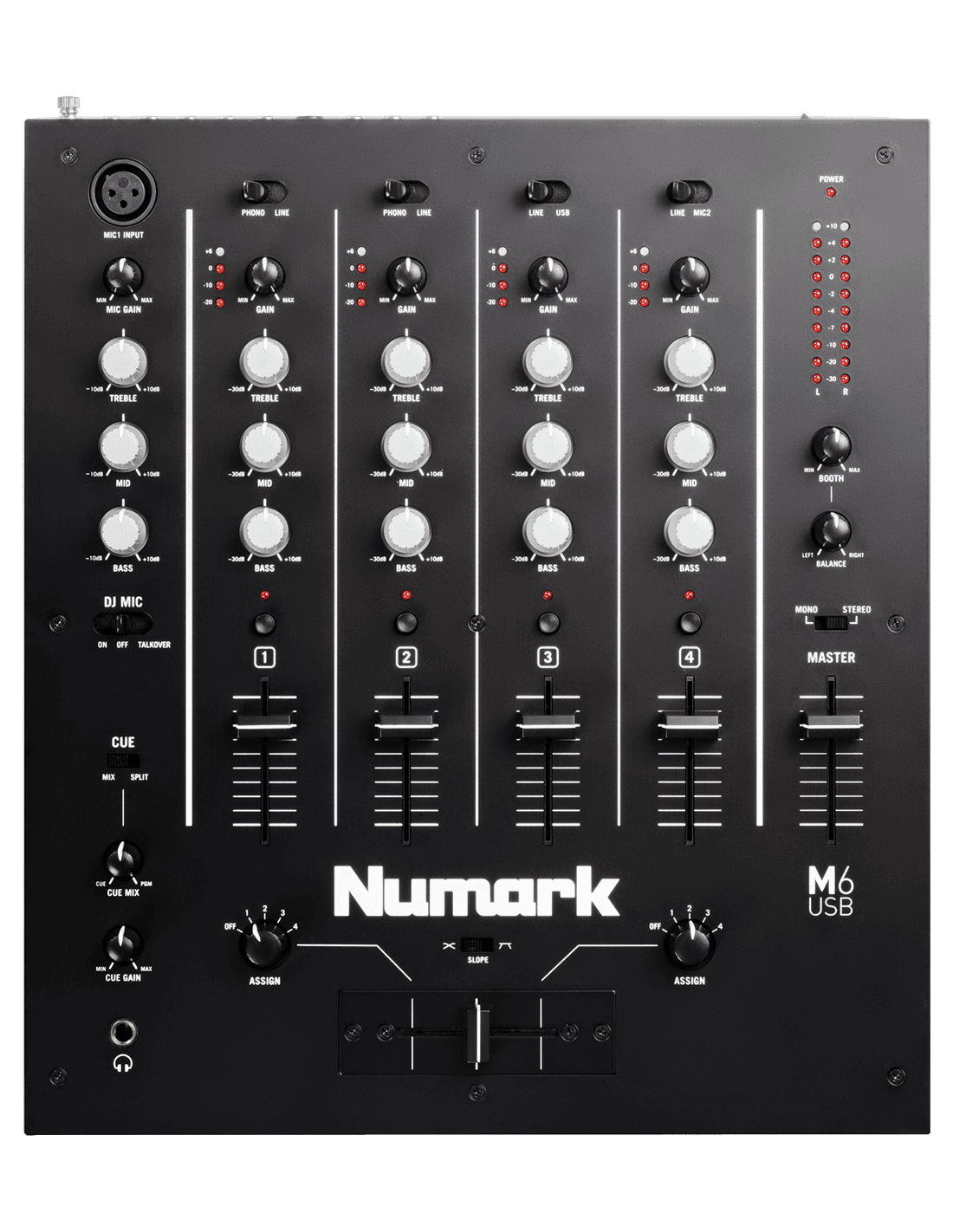 > Mixeur 4 voies, avec gain, égalisation 3-bandes et vumètre à Led