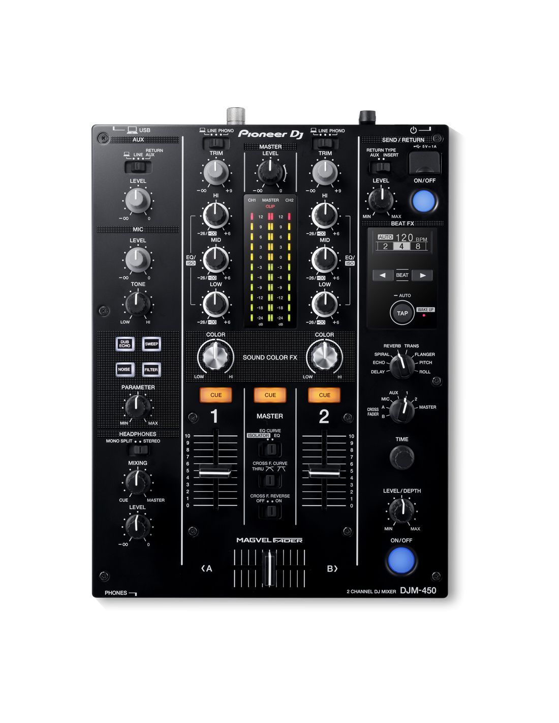 Table de Mixage DJM450 PIONEER héritant de fonctions et d’éléments de design de notre table de référence DJM-900NXS2, la DJM-450 est la table de mixage idéale à combiner avec les lecteurs multi-formats XDJ-700 ou les platines vinyles PLX-1000