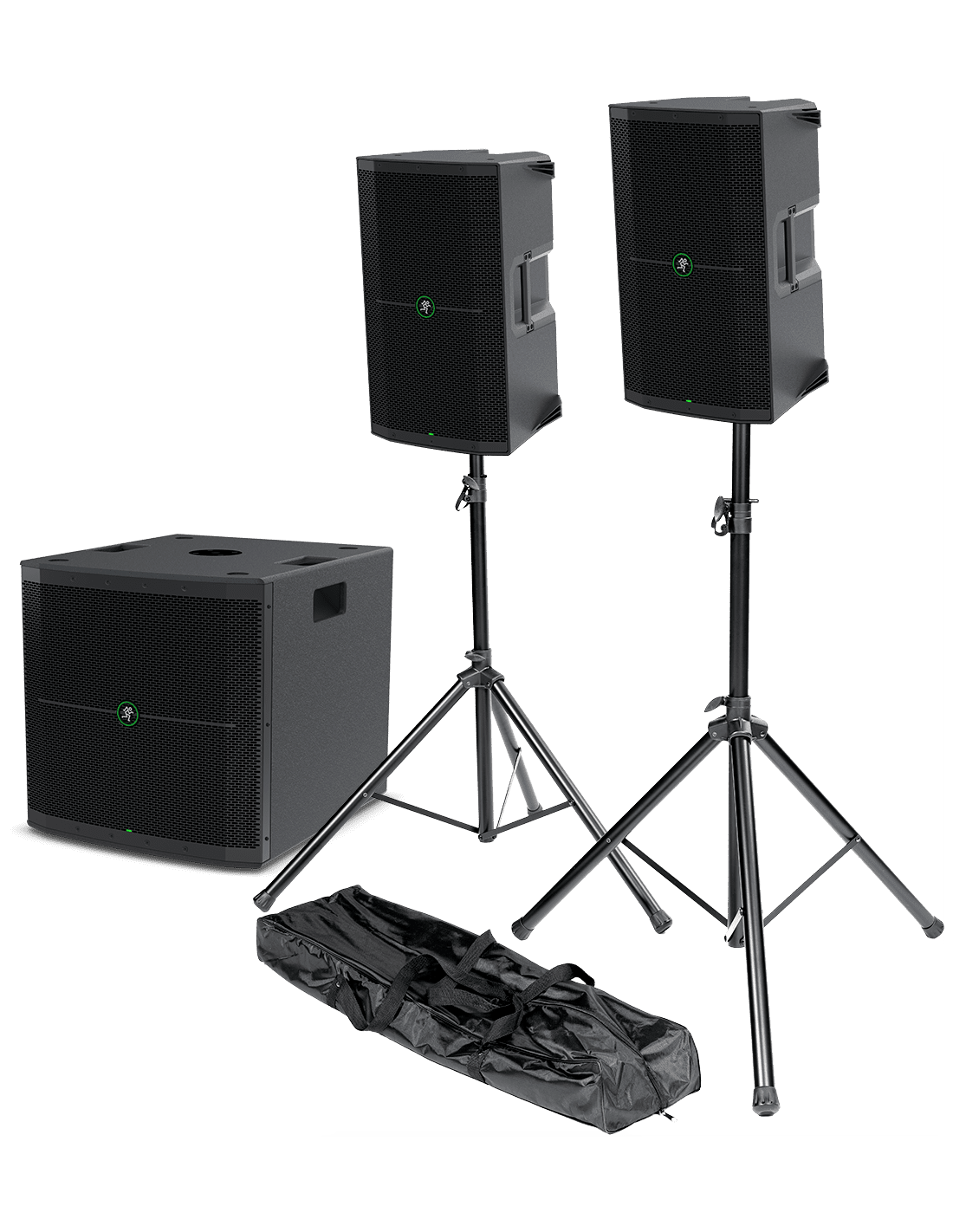 Pack sono actif 2100 W RMS composé de deux enceintes 12" + caisson de basses 18" + pieds d'enceintes avec housse de transport.