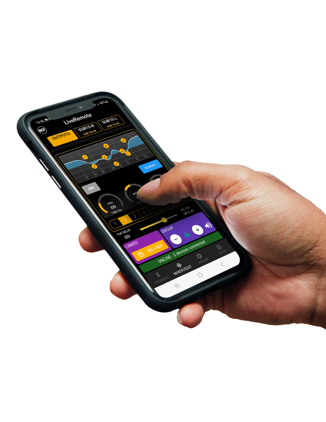 >>> Avec un RCF - SUB 15-AX, caisson de basses actif 15" 1100W RMS 133 dB SPL max. intégrant une innovation: DSP avec présets (suivant le modèle d'enceinte), pilotable avec l'écran tactile ou l'appli smartphone LiveRemote et bien d'autres à découvrir !