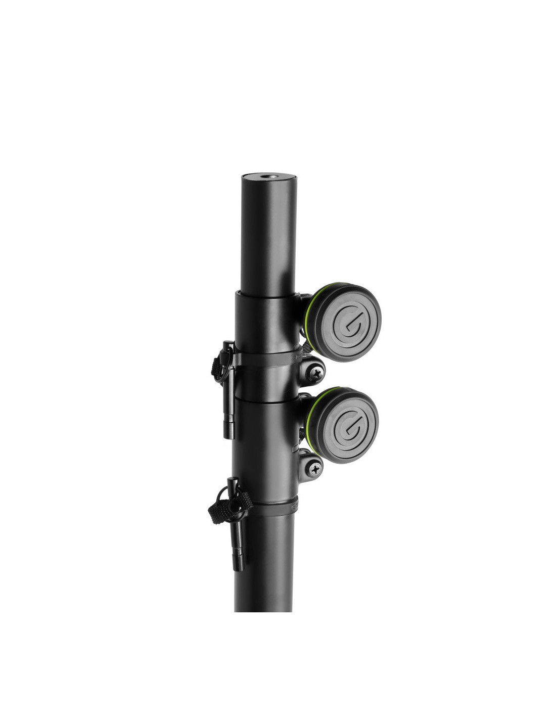 Son grand avantage : grâce à sa double extension, vous pouvez élever vos projecteurs et enceintes de sonorisation jusqu'à 3,5 mètres de hauteur. Un manchon a été ajouté à l'extrémité inférieure de la perche pour assurer une stabilité supplémentaire.