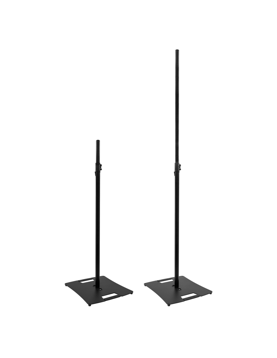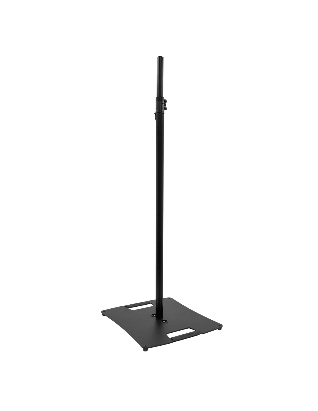 Support noir pour enceinte ou éclairage Plugger ST240, avec embase carrée en acier, tube 35 mm télescopique avec pas de vis M10 femelle.