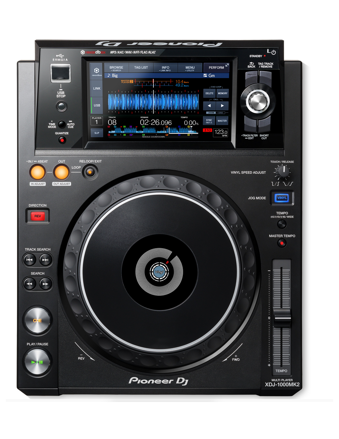Basé sur son prédécesseur, le XDJ-1000MK2 améliore l’ergonomie par une navigation enrichie dans les morceaux et une prise en charge des fichiers audio haute résolution FLAC et ALAC. Il hérite du grand jog et de l’écran tactile couleur 7 pouces du CDJ-2000NXS2, ainsi que de fonctionnalités telles que 8 Hot Cues et la fonction Quantize.