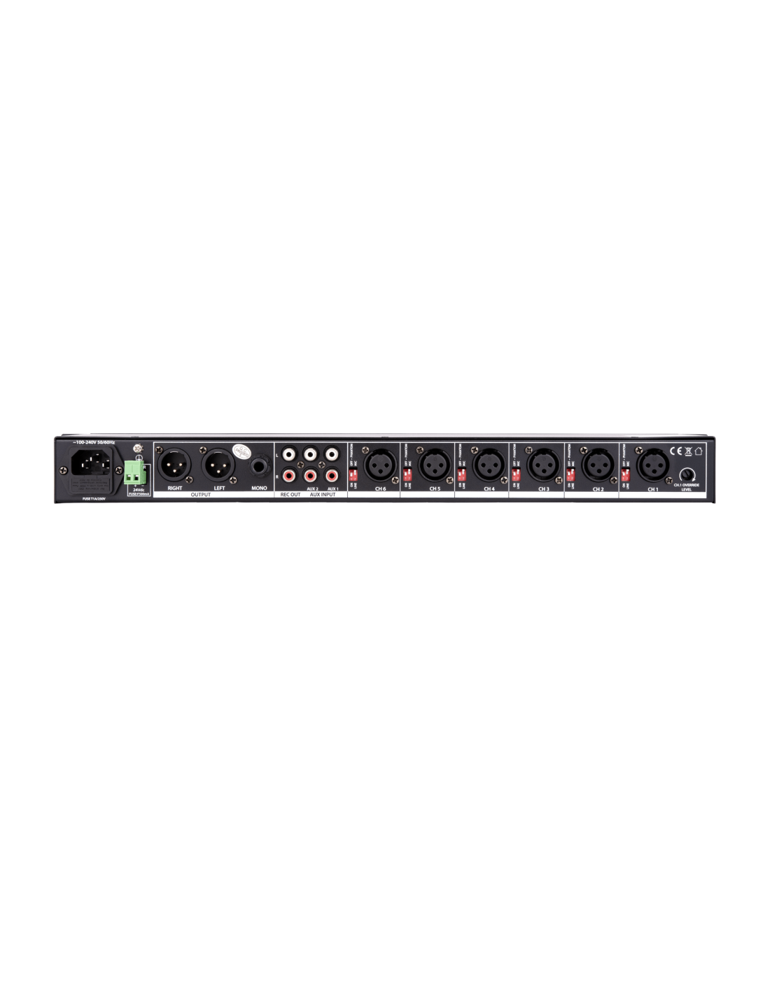 - 1 MIC OUT JACK 6,35 mm pour contrôle des signaux de sortie micros 1 à 6