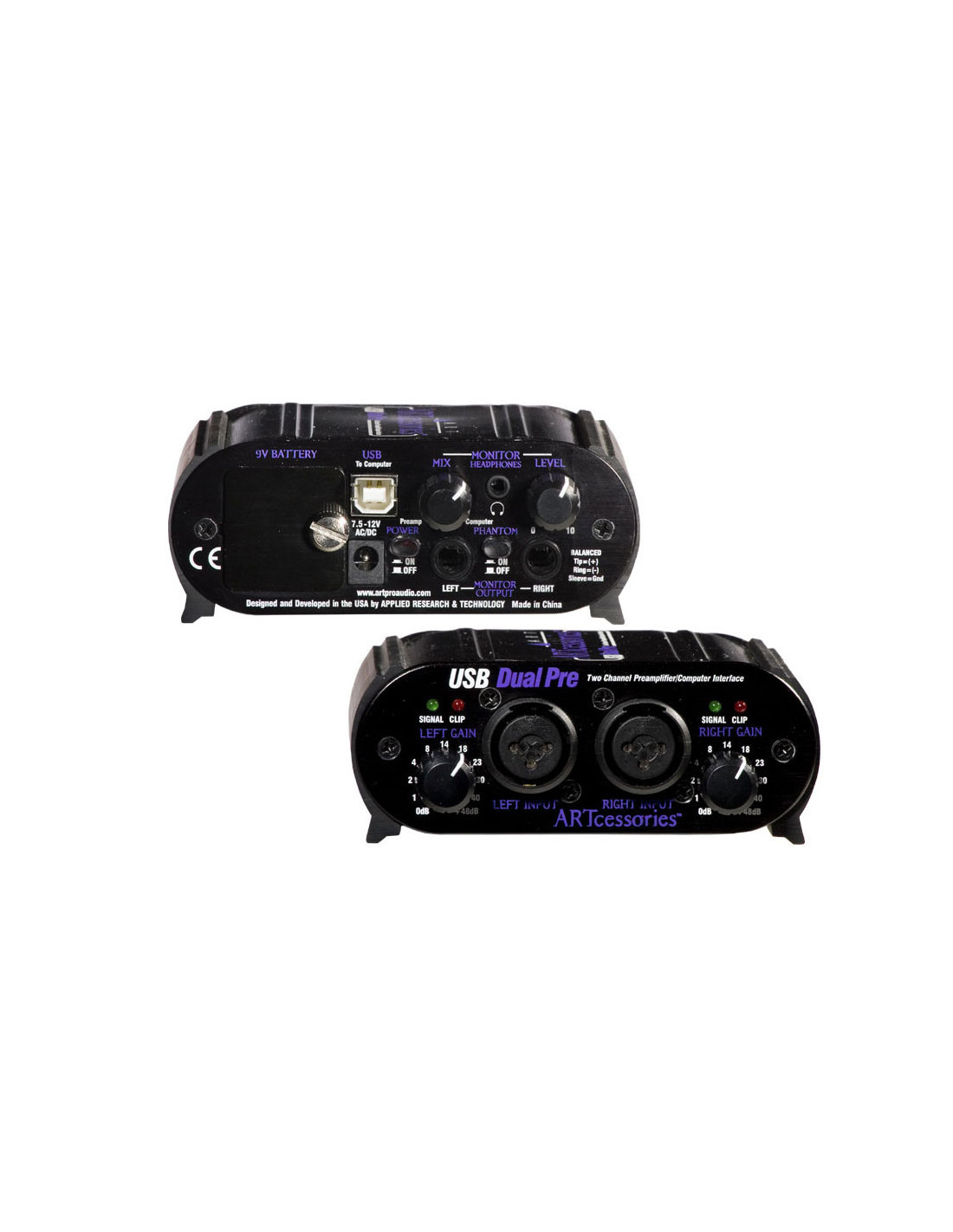 - Alimentation : via le Bus USB, batterie 9V, adaptateur secteur (vendu séparément)