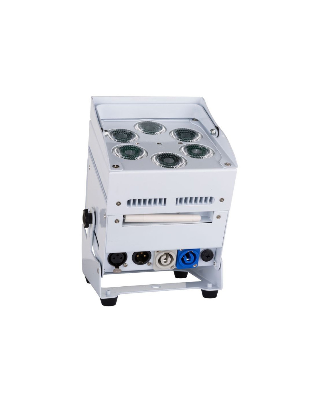 Projecteur LED alimenté par batterie, construit autour de 6 LED (10 W) RVB, blanc et ambre, pour éviter des ombres de couleur. Angle de faisceau = 22° L'angle de projection peut être fixé à 25° (de la verticale à l'horizontale).