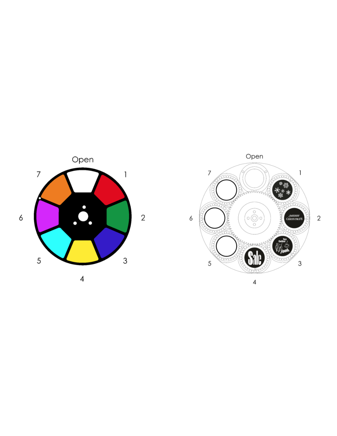 Ses 7 gobos + ouvertures permettent de projeter 7 couleurs dichroïques + blanc et peuvent être indexés, ce qui signifie que la rotation des gobos peut être annulée.