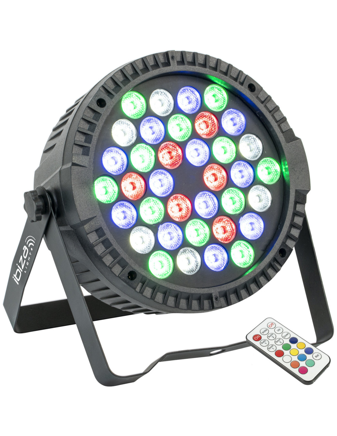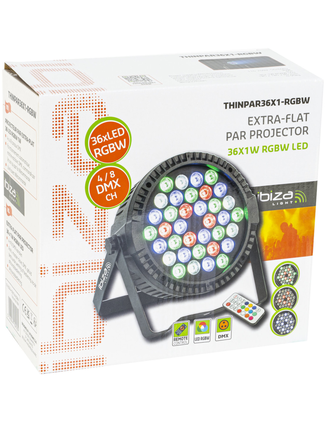 Projecteur format slimpar à source LED 36 x 1 W RGBW livré avec télécommande IR.