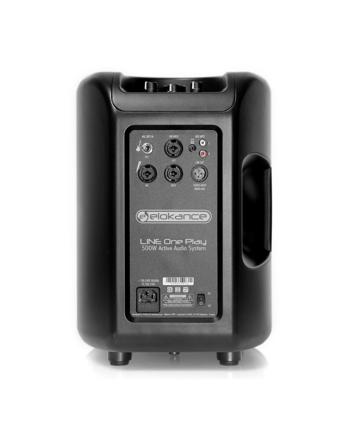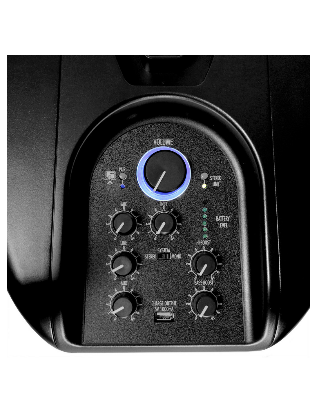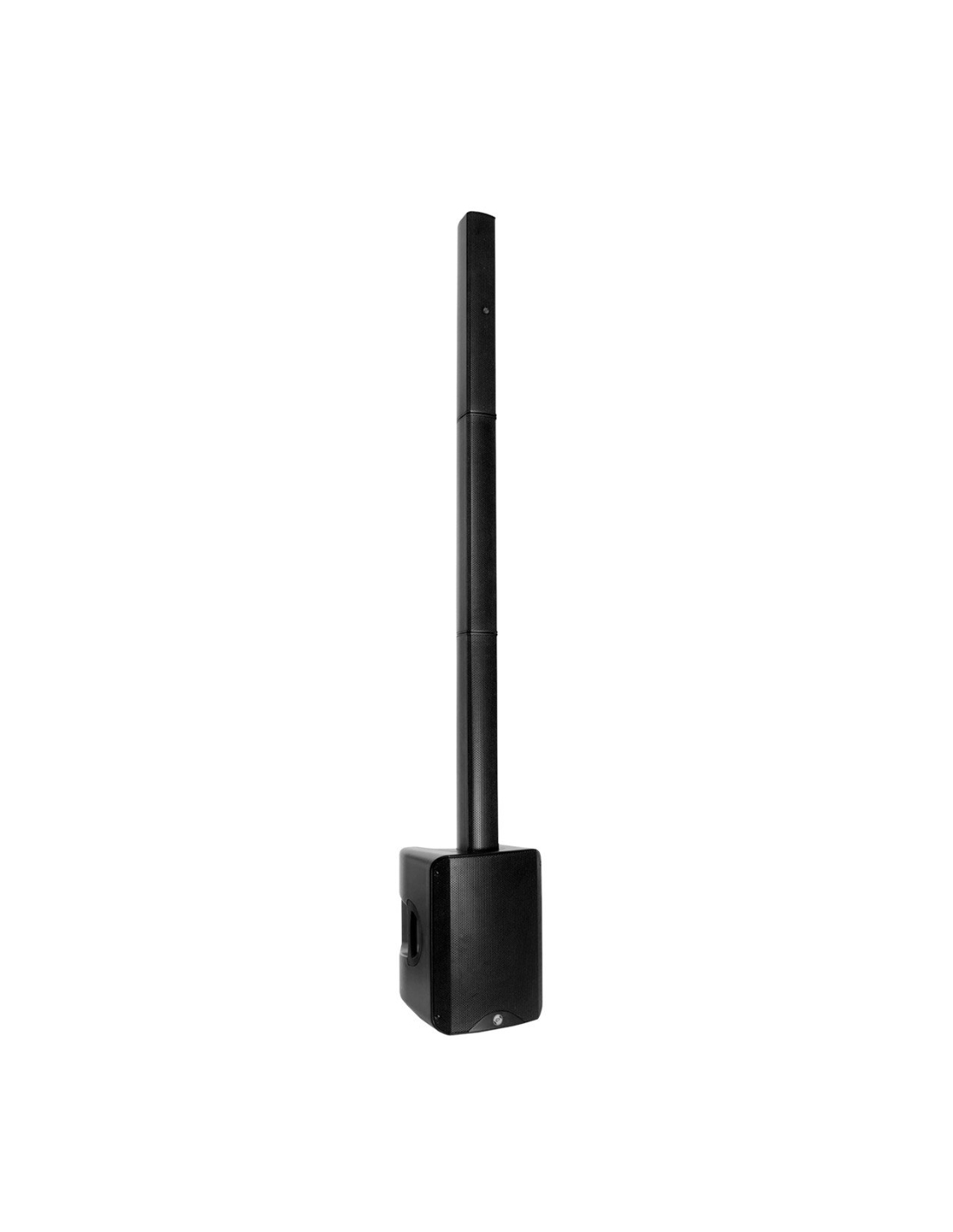 Système colonne sur batterie (autonomie 6-7 heures), amplifié 200 W RMS équipé d'un boomer 8" + 4 x 3", mixeur intégré avec récepteur Bluetooth, entrées micro et instruments.