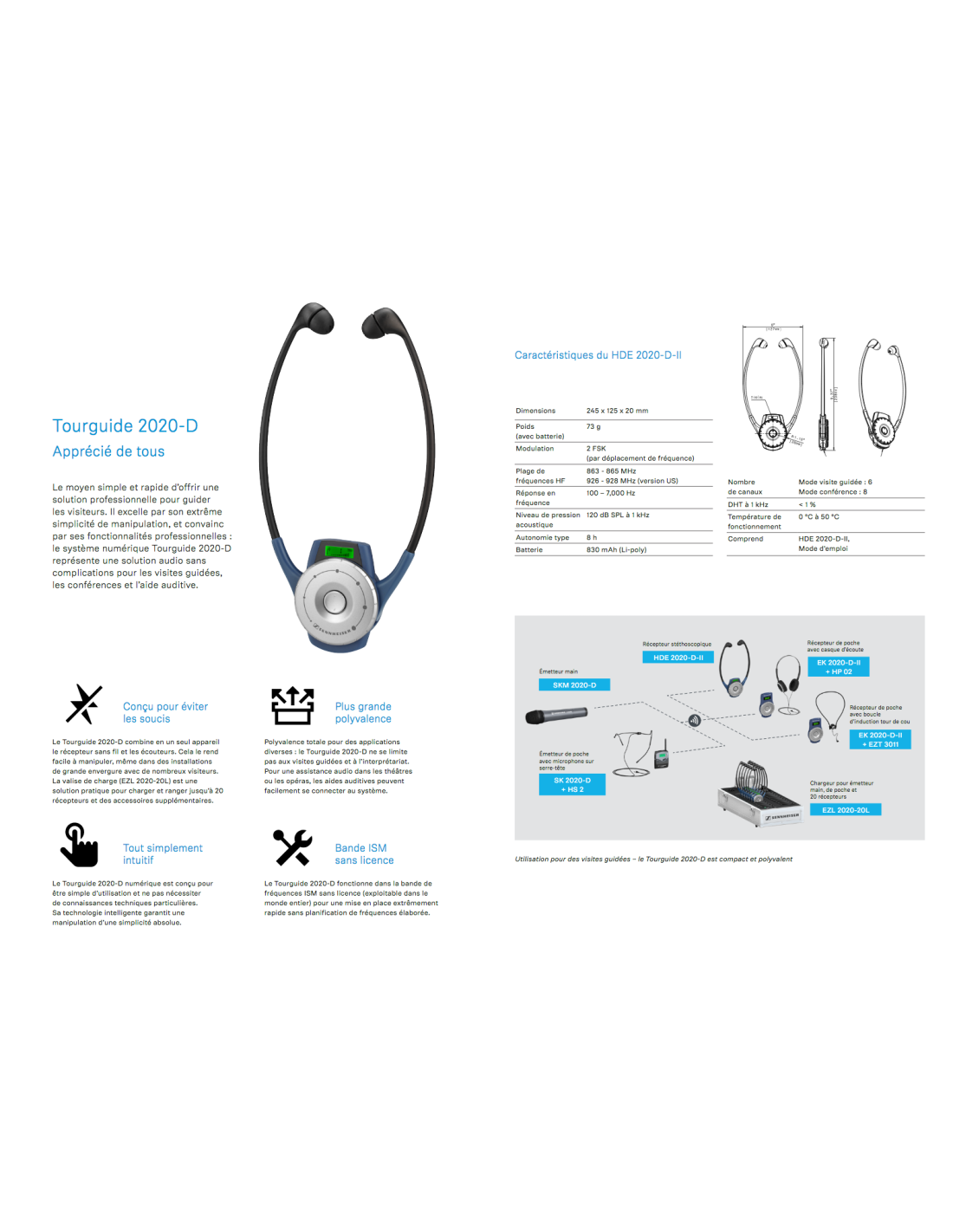 Le récepteur stéthoscopique HDE 2020-D Tourguide est le récepteur confortable du système numérique Tourguide 2020-D. Ce dispositif vraiment unique intègre à la fois le récepteur et les écouteurs et vous offre bon nombre d'avantages. Votre auditoire n'aura pas à porter plus de matériel qu'il n'est absolument nécessaire. L'appareil étant tout d'une pièce, ils ne risqueront plus d'enchevêtrer les câbles ! La puissante batterie garantit jusqu'à 8 heures d'autonomie. Que vous fassiez votre visite dans une grande ville ou une grosse entreprise, le Tourguide 2020-D fera en sorte qu'elle se fasse sans interruption.