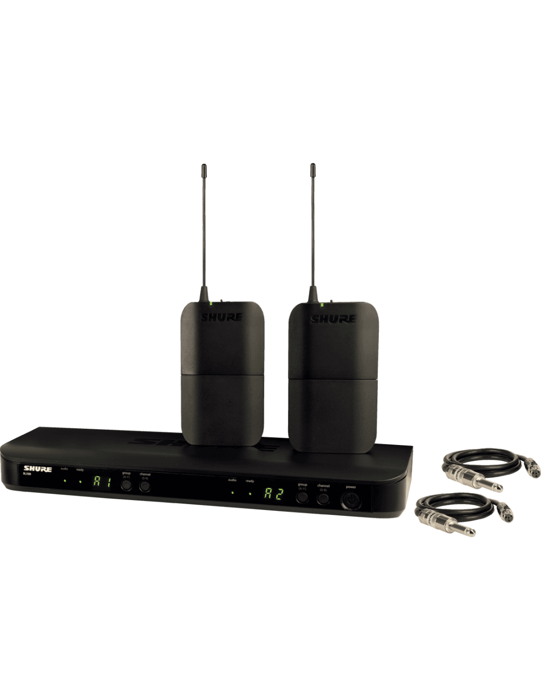 Système complet double pour guitare et basse. Composé d'un récepteur double BLX88E, de deux émetteurs ceinture BLX1 et de deux câbles instrument jack 6,35 mm WA302.