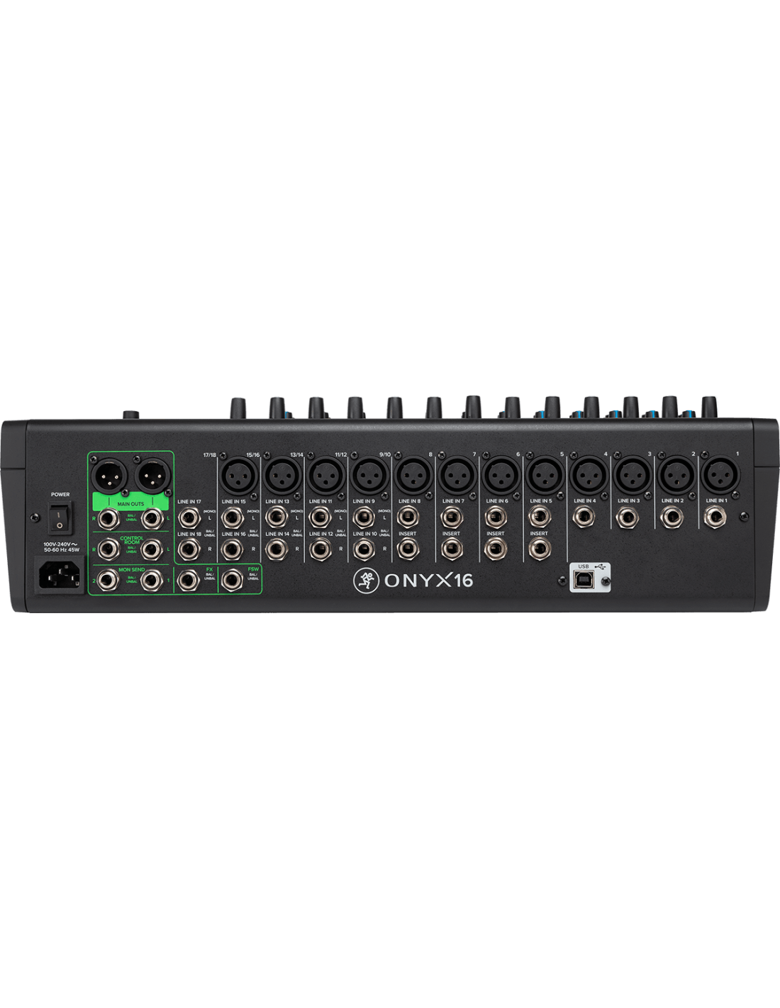 - Port USB (lecture et enregistrement multipiste 16x4, retour USB sur les tranches 13/14 et 15/16)