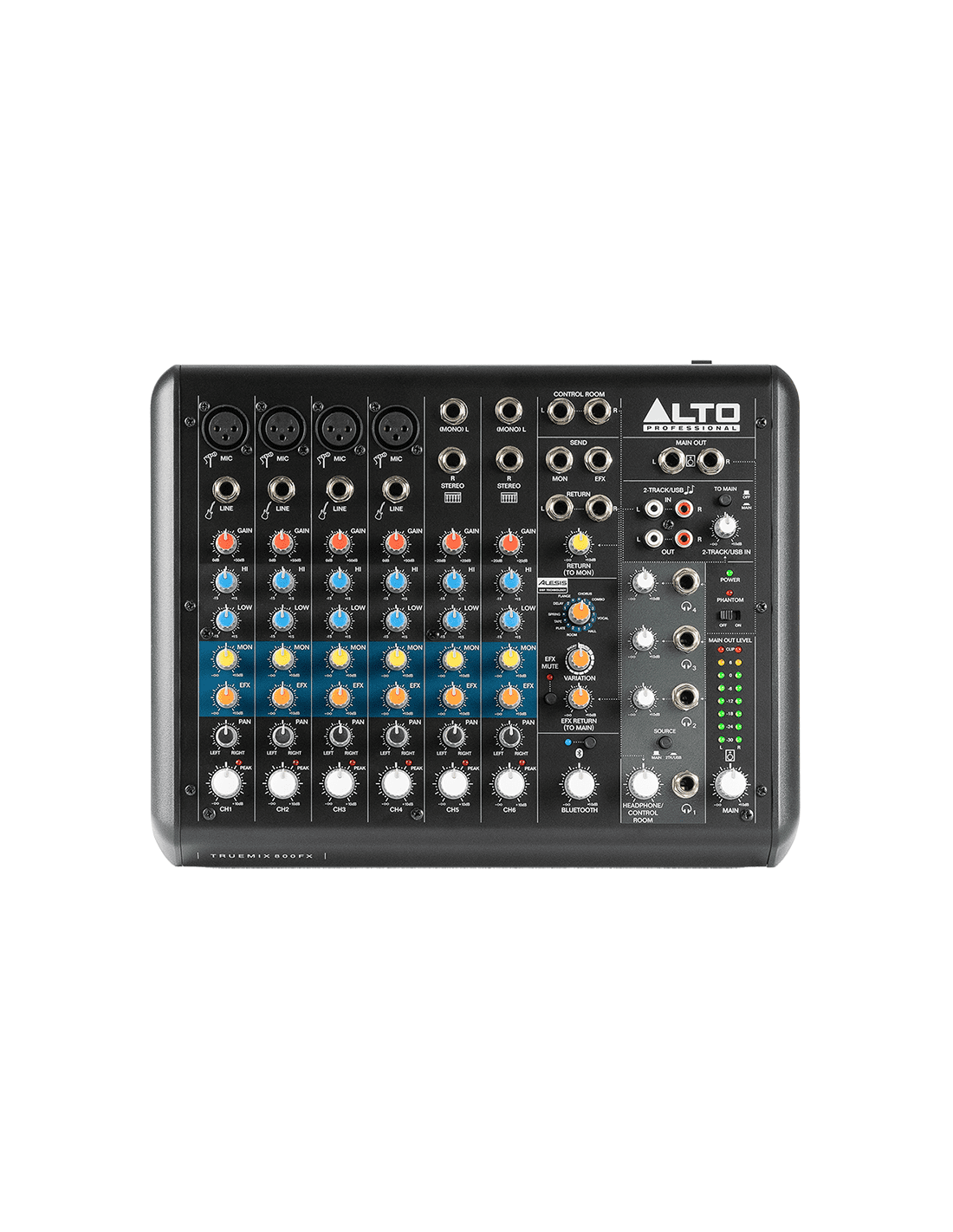 Pour compléter une dotation déjà très riche, la TrueMix 800 FX dispose d'un module 16 effets intégré signé Alesis, pilotable via un encodeur 16 positions associé à un potentiomètre EFX Return pour régler le niveau global d'effets, et Variation pour moduler vos effets. En parallèle, chaque tranche présente un potentiomètre EFX, vous permettant de déterminer le niveau d'effet qui sera appliqué à la voie.