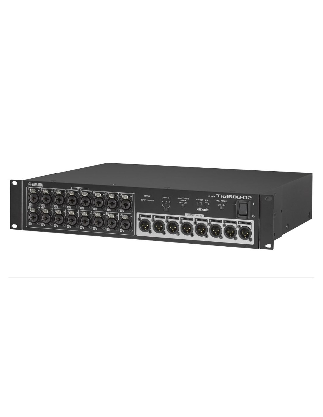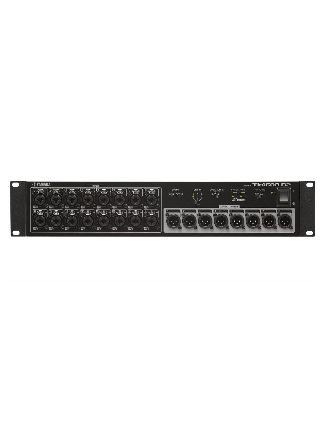 Le Tio1608-D2 est un rack d’entrée/sortie (« stagerack », ou boîtier de scène) Dante équipé de 8 entrées micro/ligne et de 8 sorties au niveau ligne. Les préamplis micro du Tio1608-D2 sont contrôlables à distance depuis une console de la Série TF. La connexion d’un boîtier Tio1608-D, placé sur scène, à une console TF en façade s’effectue par un simple câble réseau de type CAT5e, assurant un transfert de haute qualité des données audio, avec une latence réduite. Plus besoin de câbles multipaires lourds et rigides, ni de connecteurs multipoints encombrants.